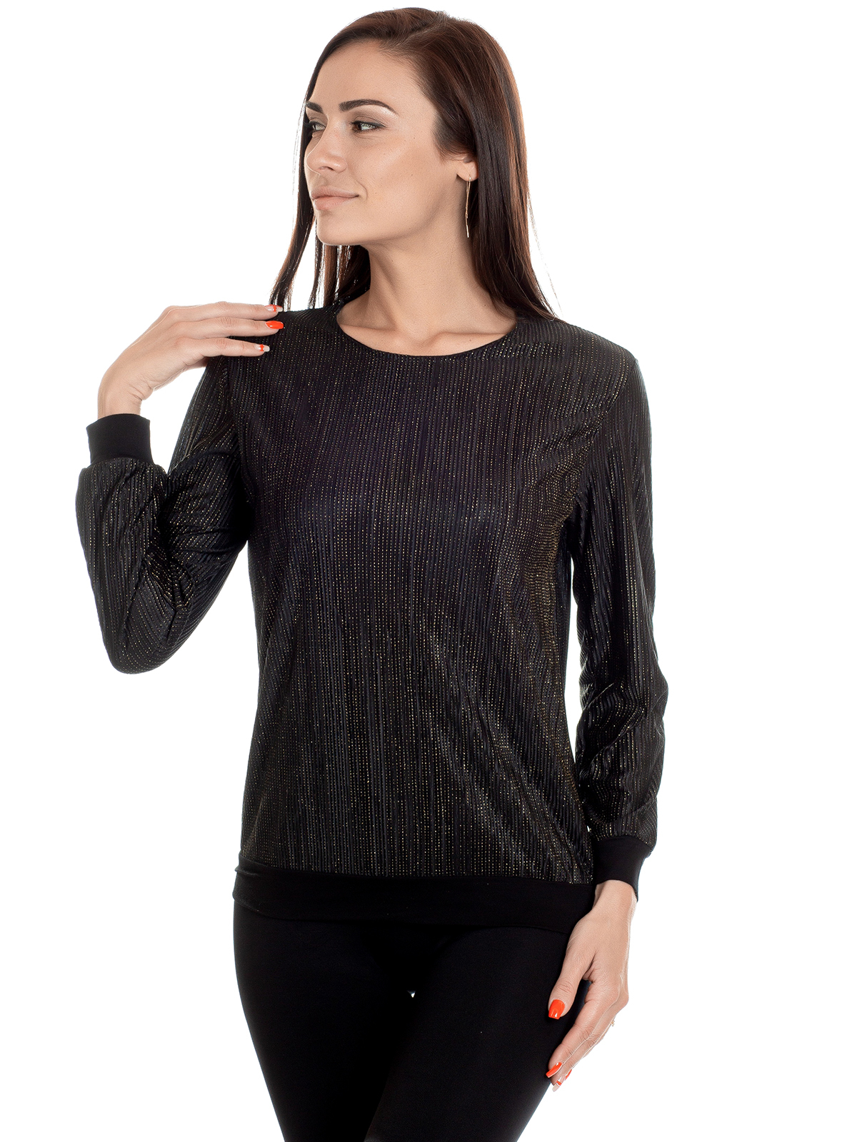 Праздничная блузка с аккуратным круглым воротом и длинными рукавами, выполненная из эластичной вискозы. Модель декорирована узором в виде блестящих тонких полосочек.