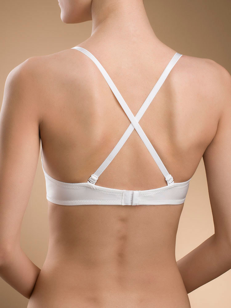 Бюстгальтер с гладкими формованными чашечками на каркасах с эффектом пуш ап. Мультифункциональные отстегивающиеся бретели с возможностью застегивания крест-накрест. Отделка - бантики.