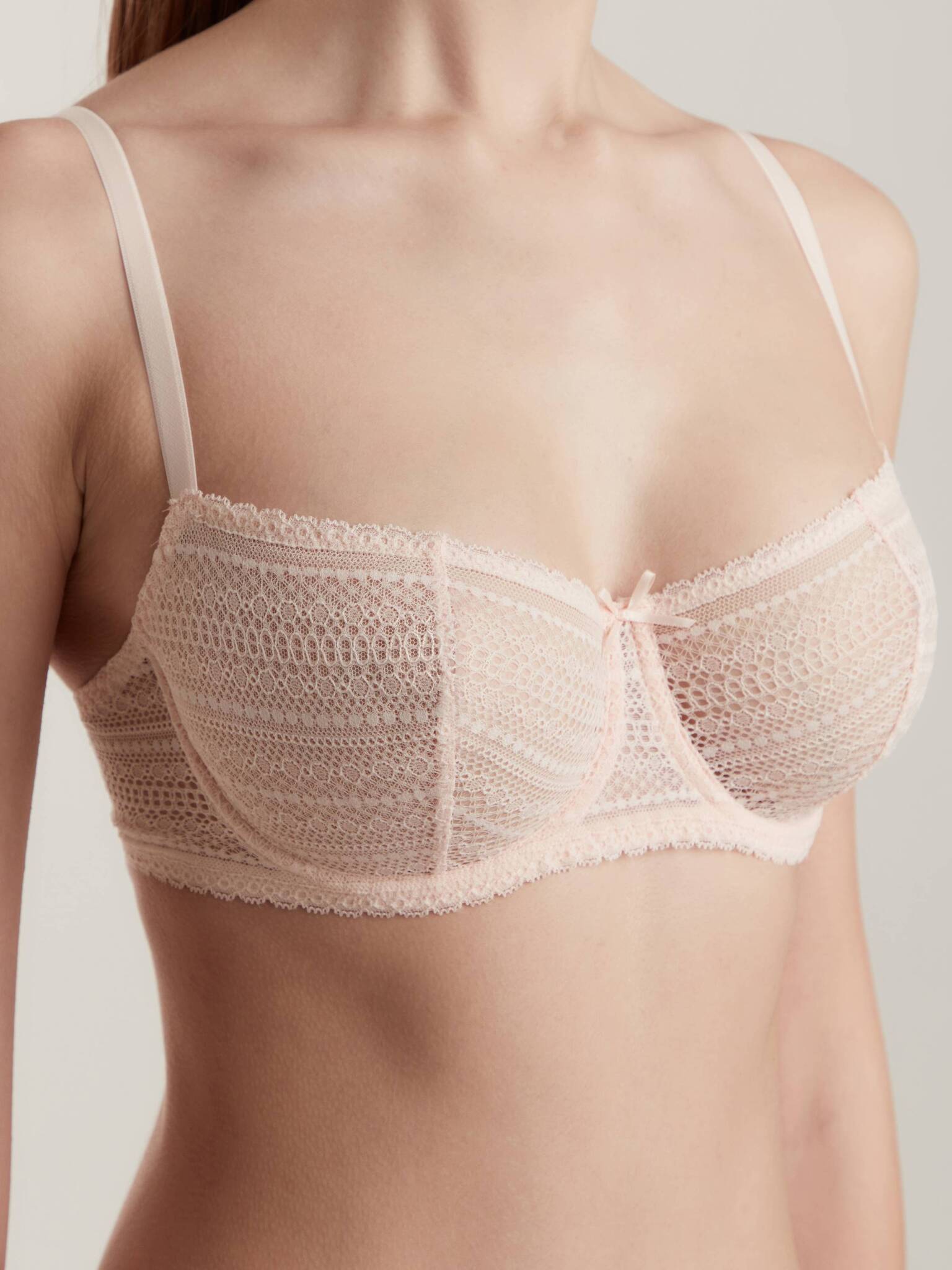 Бюстгальтер балконет с мягкими чашками выполнен из кружева с ажурным орнаментальным рисунком и прямым краем. Современный образ, безупречная посадка на фигуре и легкость конструкции – визитная карточка модели.
