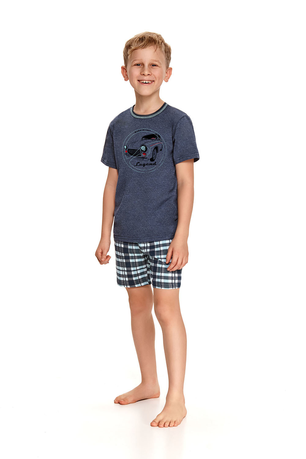 Пижама Damian для мальчиков состоит из футболки и клетчатых шорт. Футболка свободного кроя, с круглым вырезом горловины. Шорты на мягкой широкой резинке. Пижама идеально подходит для сна и в качестве домашнего костюма.