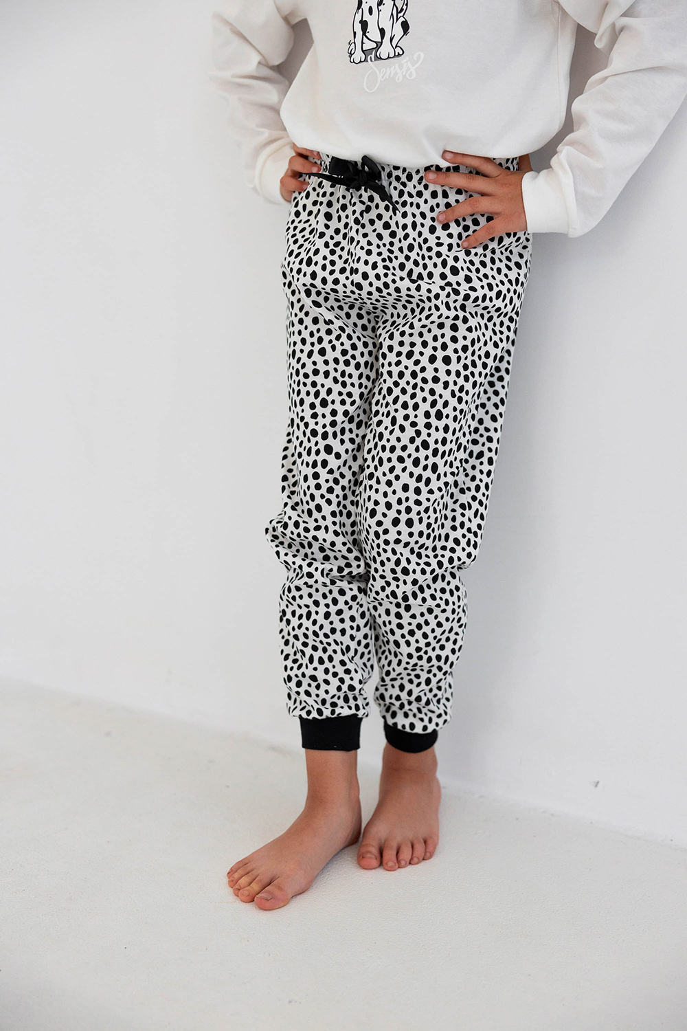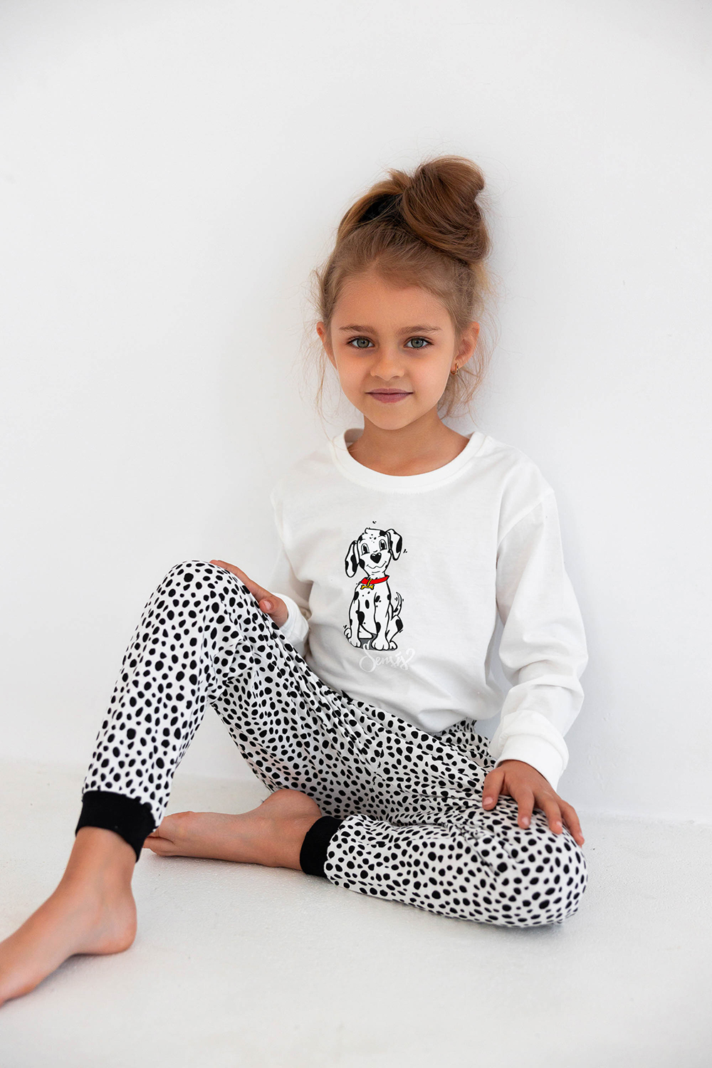 Детская пижама Rolly состоит из лонгслива и зауженных брюк. Лонгслив с длинными рукавами и круглым вырезом горловины. Брюки на мягкой широкой резинке. Пижама декорирована принтом далматинец. Идеальный вариант не только для сна, но и для домашнего отдыха.