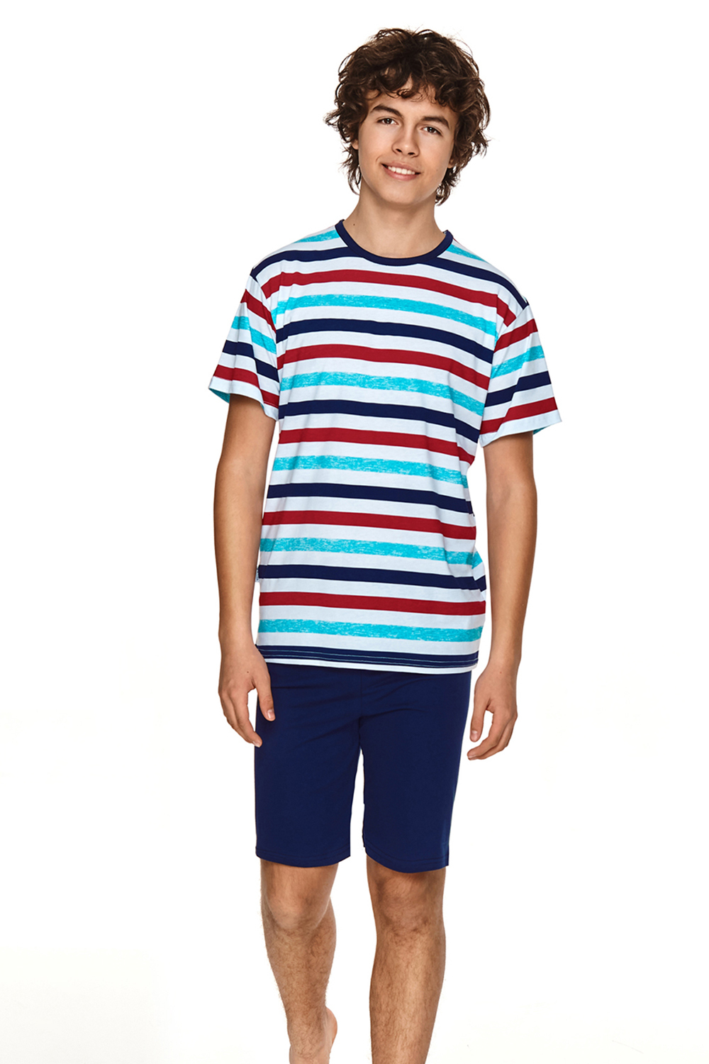 Хлопковая пижама для мальчиков Luka состоит из футболки в полоску и однотонных шорт. Футболка свободного кроя, с круглым вырезом горловины. Шорты на мягкой широкой резинке, с карманами . Пижама идеально подходит для сна и в качестве домашнего костюма.