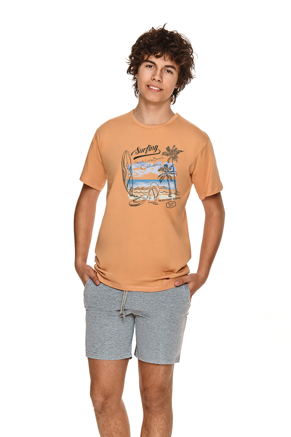 Яркая пижама для мальчиков Wadim. Пижама выполнена из качественного и мягкого хлопка, состоит из оранжевой футболки с коротким рукавом и прямых серых шорт с карманами. Пижама очень комфортная и удобная, будет отличной домашней одеждой и замечательным подарком для близких людей.