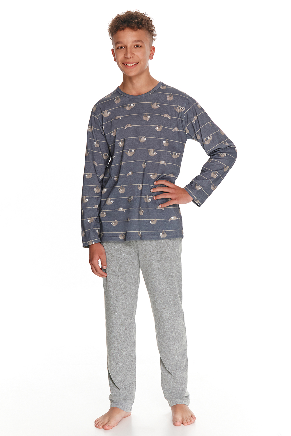 Хлопковая пижама Harry серого цвета. Пижама выполнена из качественного и мягкого хлопка, декорирована милым принтом. Лонгслив с длинными рукавами и круглым вырезом горла, брюки с мягкой резинкой в поясе, внизу на манжетах.