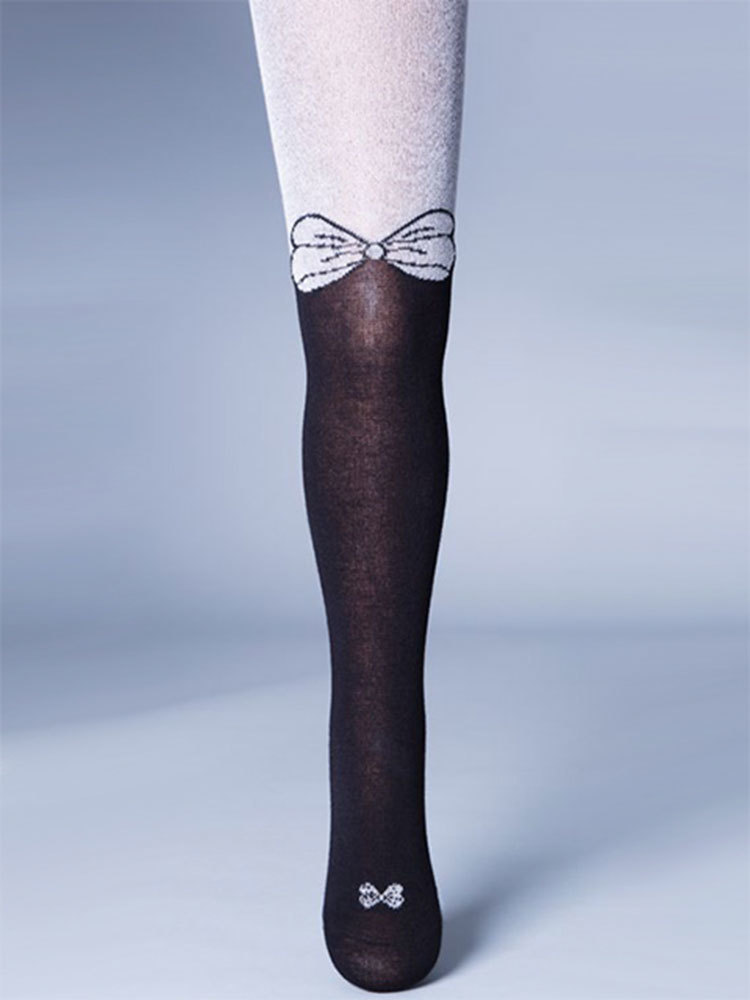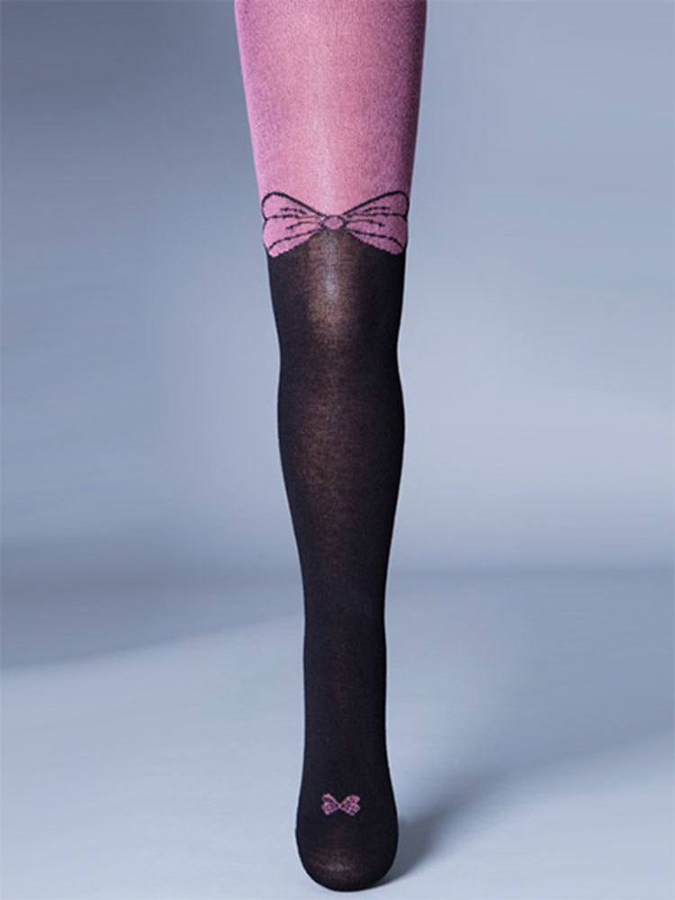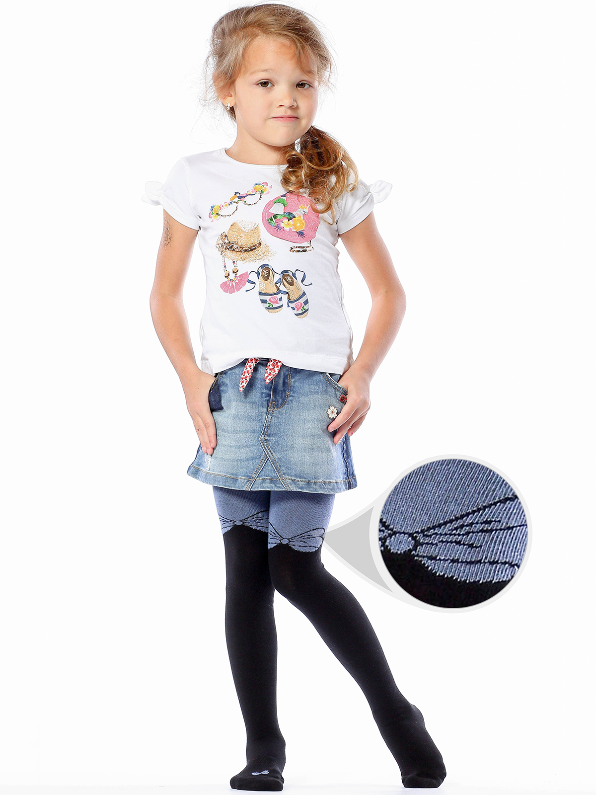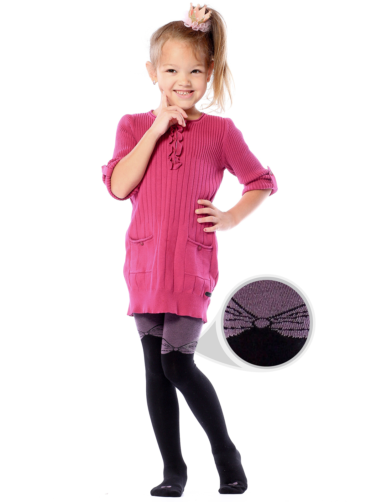 Плотные хлопковые детские и подростковые колготки для девочек с имитацией контрастных ботфортов с узором в виде банттиков. Комфортный широкий пояс, провязанная пяточка, удобная задняя вставка и укрепленный мысок.