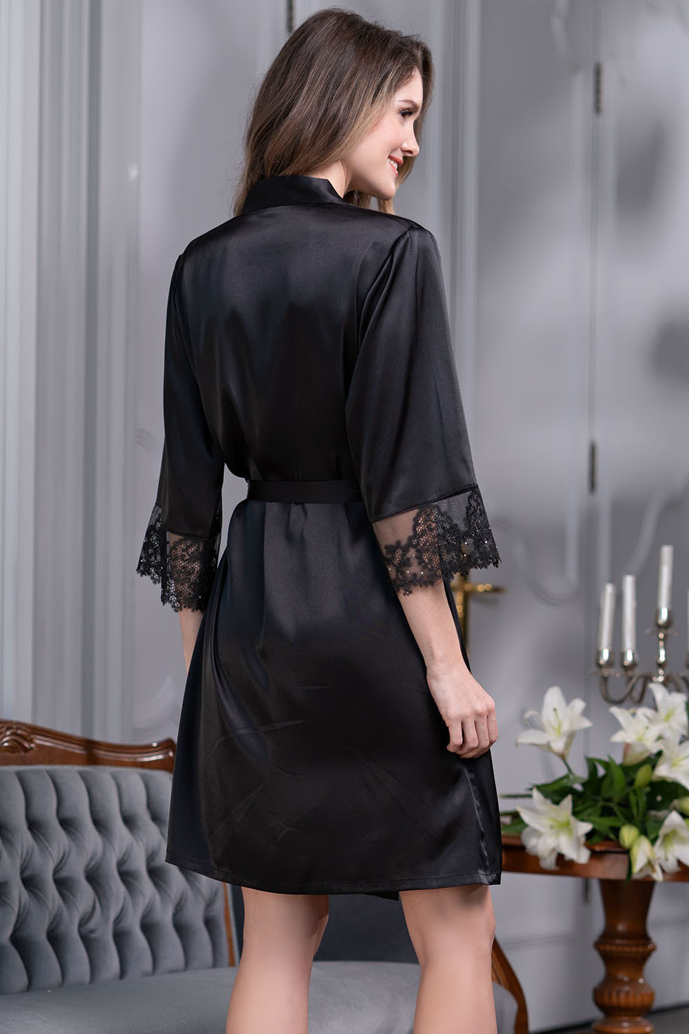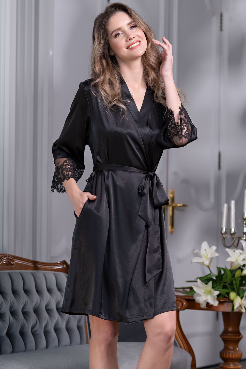 Короткий классический запашной халат Mia-Amore с рукавами длиной 3/4, выполнен из смесового однотонного шелка. Низ рукавов обработан французским кружевом, которое инкрустировано кристаллами Swarovski. По бокам расположены карманы.