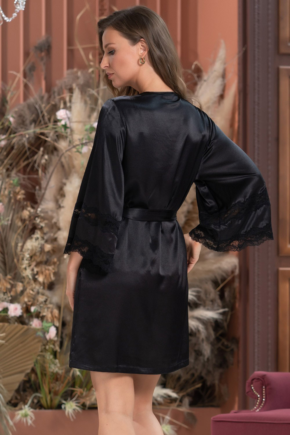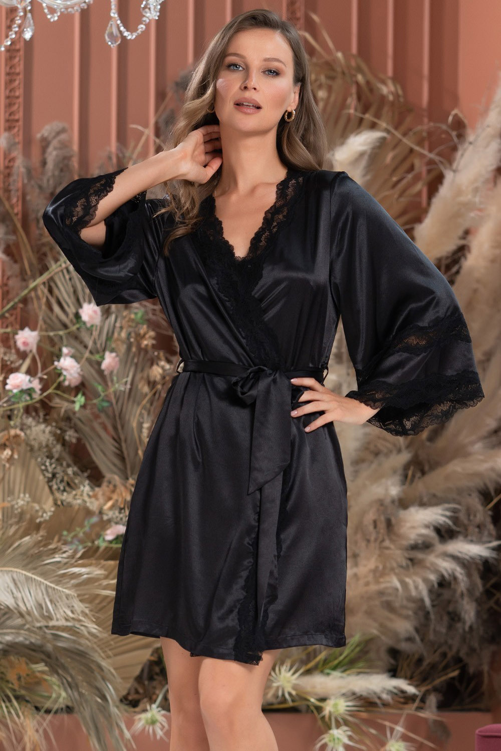 Короткий запашной халат Mia-Amore с широким длинным рукавом, выполнен из однотонного смесового шелка и декорирован кружевными вставками, по бокам расположены карманы.