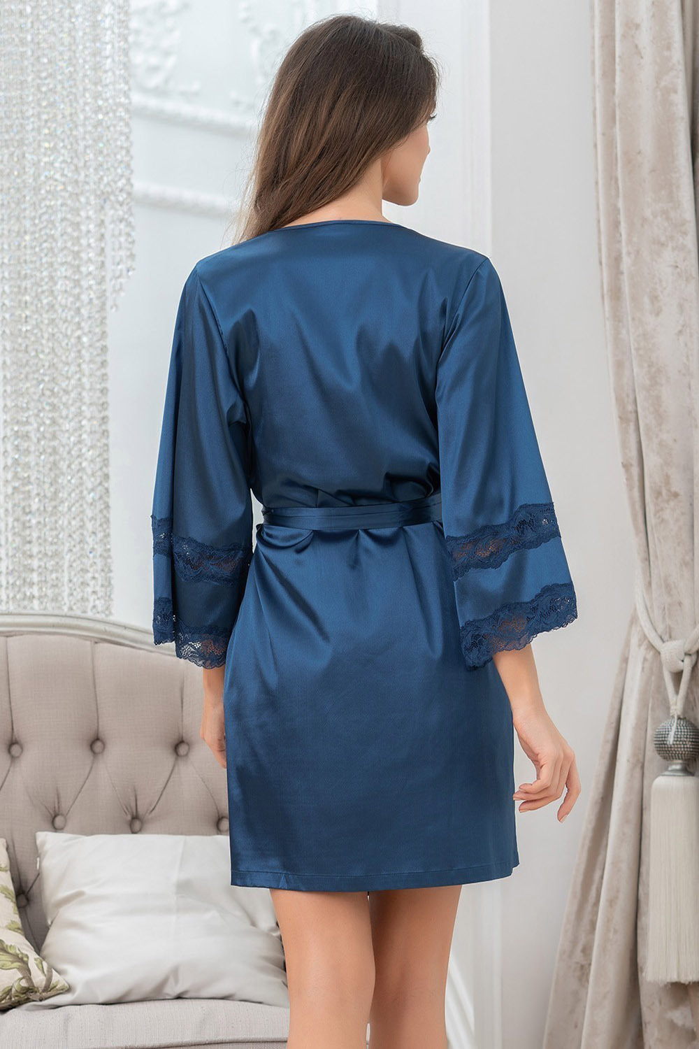 Короткий запашной халат Mia-Amore с широким длинным рукавом, выполнен из однотонного смесового шелка и декорирован кружевными вставками, по бокам расположены карманы.