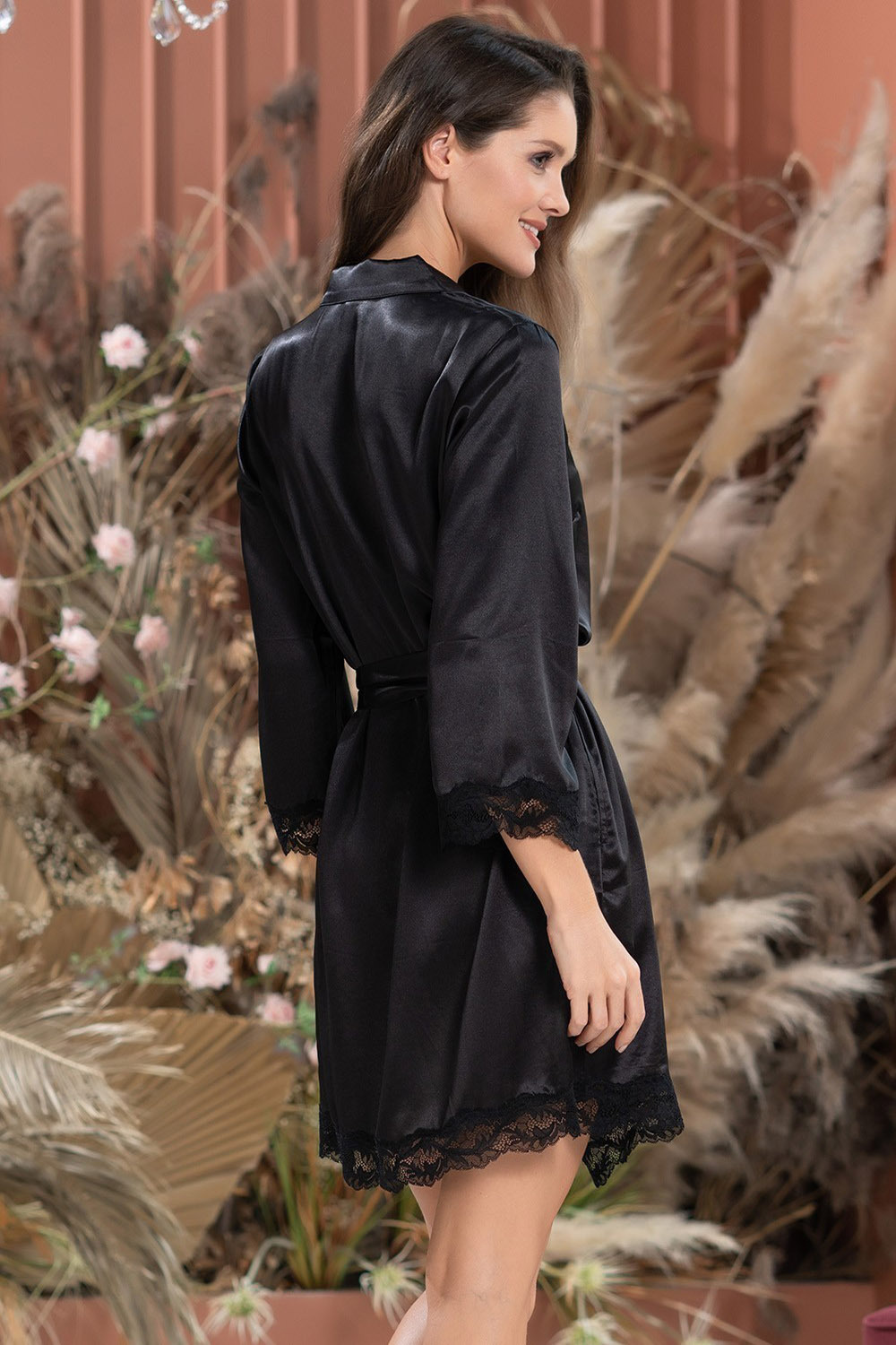 Короткий халат Mia-Amore на пуговицах с рукавом длиной 7/8, выполнен из однотонного смесового шелка и декорирован кружевными вставками по низу рукавов и низу изделия. В боковых швах обработаны карманы. Линию талии можно подчеркнуть за счет широкого пояса, который идет в комплекте.