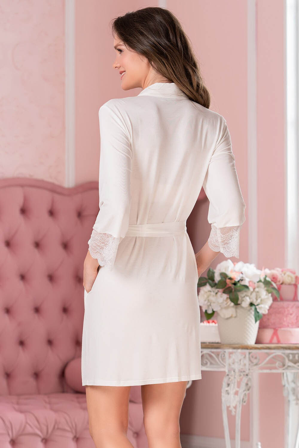 Короткий халат Mia-Amore на пуговицах с рукавом длиной 3/4, выполнен из однотонного трикотажного полотна и декорирован кружевом, которое расположено по низу рукавов. По бокам обработаны карманы. Халат дополнен атласным поясом.