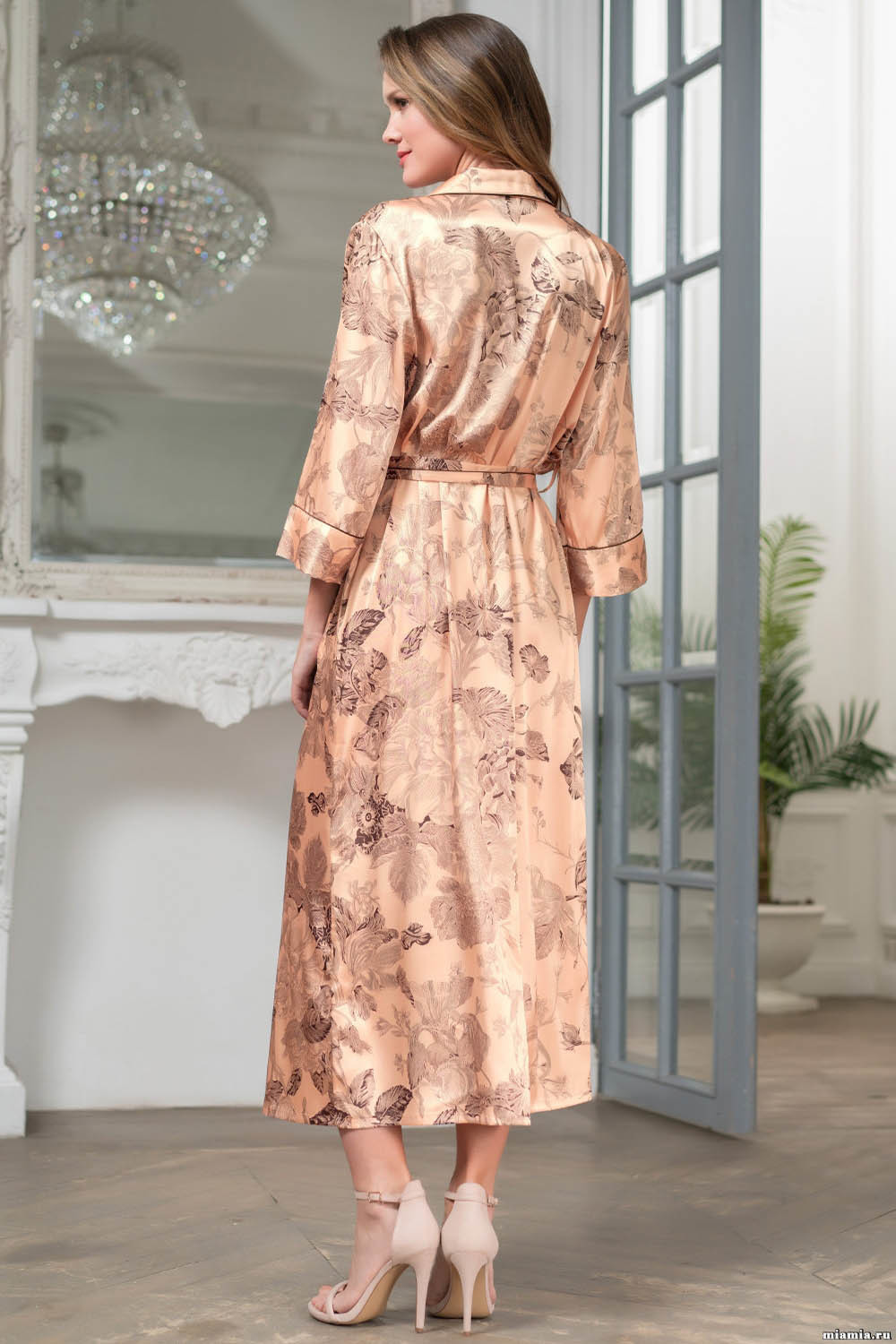 Элегантный длинный халат на пуговицах Mia-Amore выполнен из смесового шелкового полотна с цветочным орнаментом. Отложной воротник, линия бортов, притачные широкие манжеты рукавов и накладные карманы халата декорированы отделкой в виде канта цвета графит, в тон принта. В комплекте к халату идет пояс.