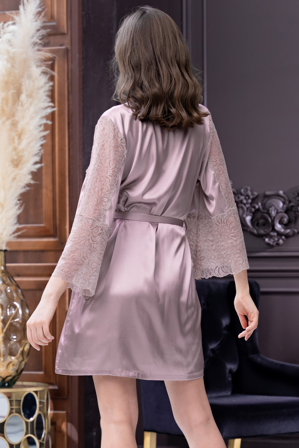Короткий запашной халат Mia-Amore с широкими кружевными рукавами длиной 3/4. Халат выполнен из однотонного искусственного шелка. В боковых швах расположены карманы. Линия талии подчеркивается за счет широкого пояса с кружевными вставками на концах.
