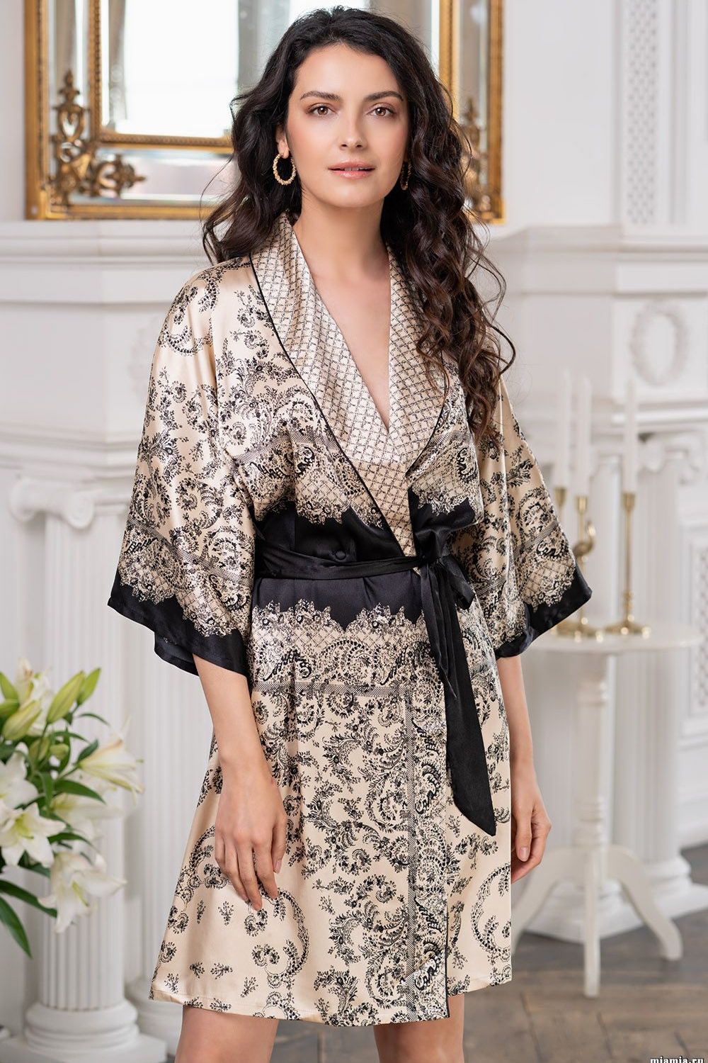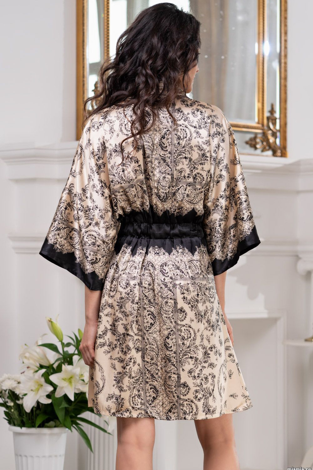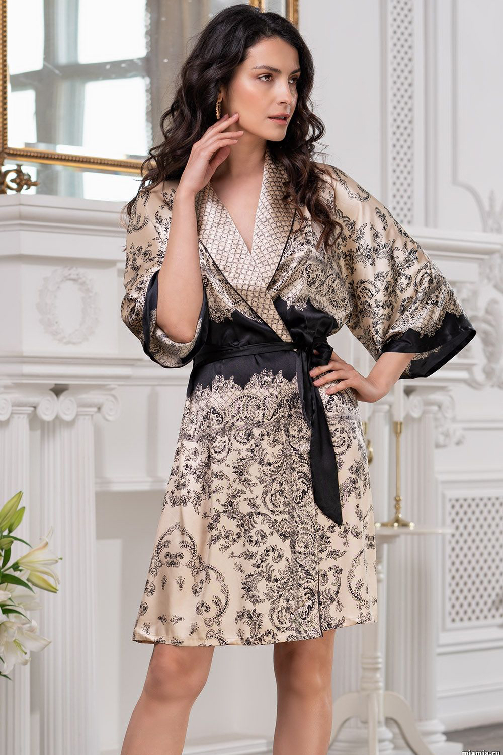 Короткий двубортный халат Mia-Amore с широкими рукавами длиной 3/4 и шалевым воротником. Выполнен из смесового шелка с купонным принтом, с отделкой тканью компаньоном и контрастными кантами. По бокам расположены карманы. Линию талии можно подчеркнуть за счет пояса.