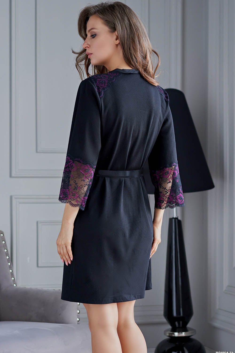 Короткий халат Mia-Amore выполнен из фактурного трикотажного полотна в рубчик. Низ рукавов 3/4 элегантно украшен широкой полосой двухцветного эластичного кружева. На плечах полочки и спинке ажурные кружевные вставки. В боковых швах карманы. В комплекте идет пояс из трикотажного полотна.