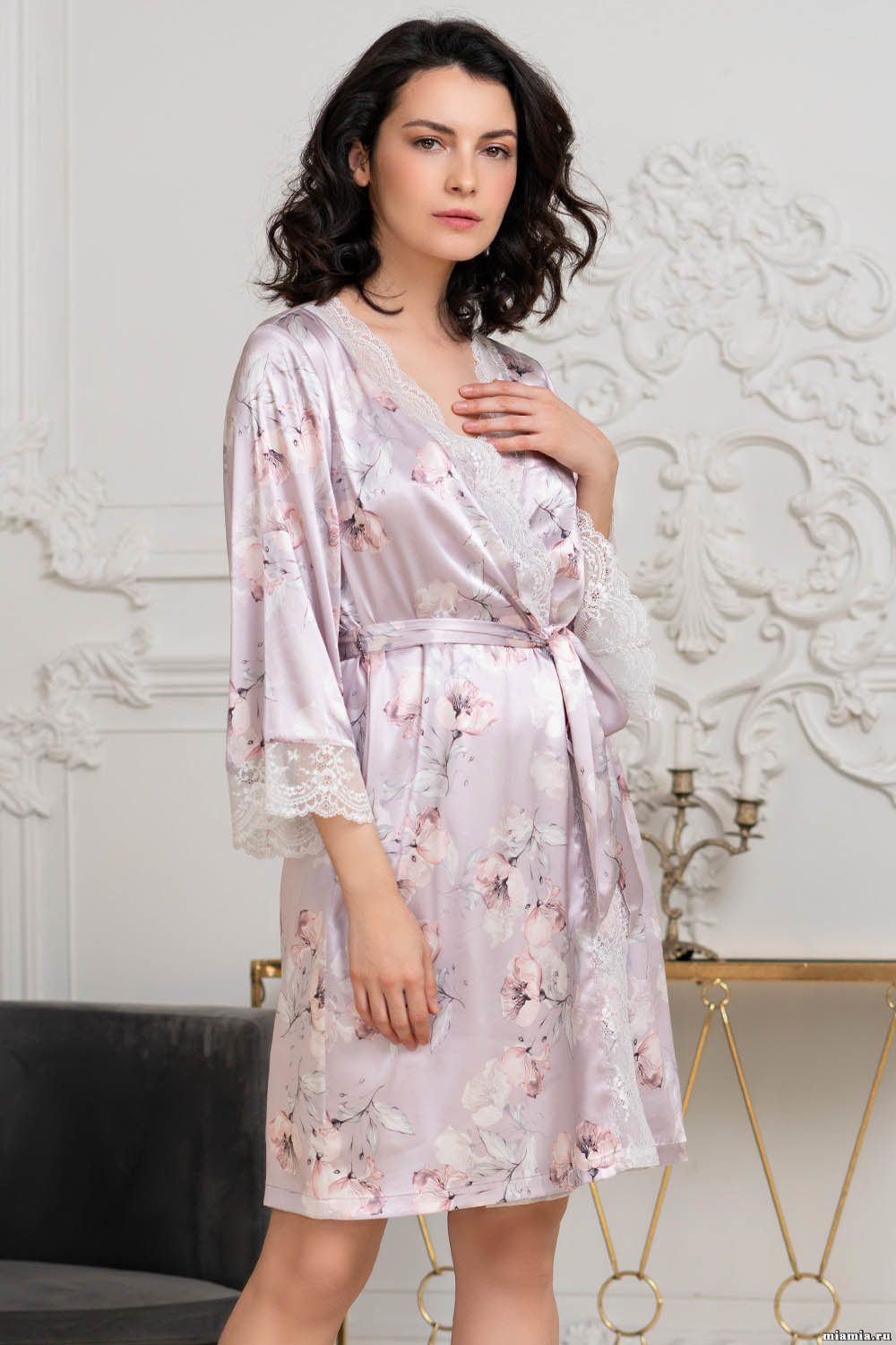 Короткий запашной халат Mia-Amore с широким длинным рукавом, выполнен из принтованного смесового шелка и декорирован ажурным кружевом, которое расположено по низу рукавов и вдоль бортов полочек. По бокам обработаны карманы.