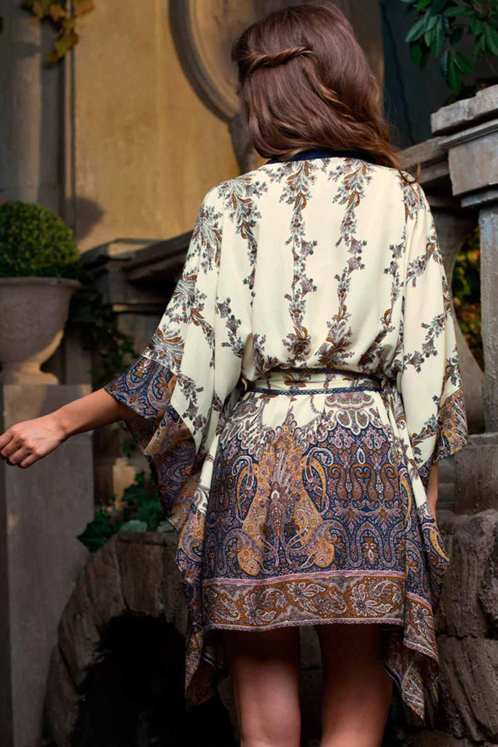 Короткий халат представляет собой квадрат с прорезями под пояс выполнен из вискозы с фантазийным принтом. V-образный вырез горловины полочки и круглый вырез горловины спинки, а так же борта полочки обработаны узкой обтачкой из однотонной ткани, которая великолепно сочетается с принтом на ткани. Халат завязывается на пояс, отделанный однотонным кантом из мелкого кружева. Кисти на поясе великолепно сочетаются с принтом на ткани и придают модели восточный колорит.