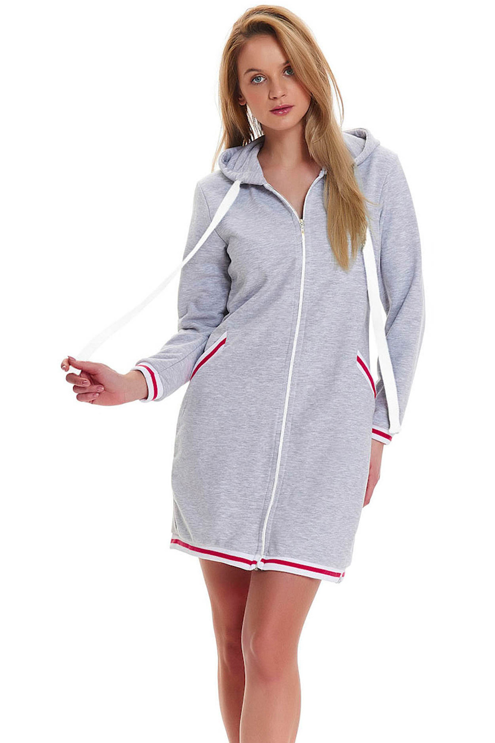 Серый халат SMZ.9455 Grey Melange на молнии, с капюшоном и красно-белыми полосками на резинке, карманах и рукавах.
