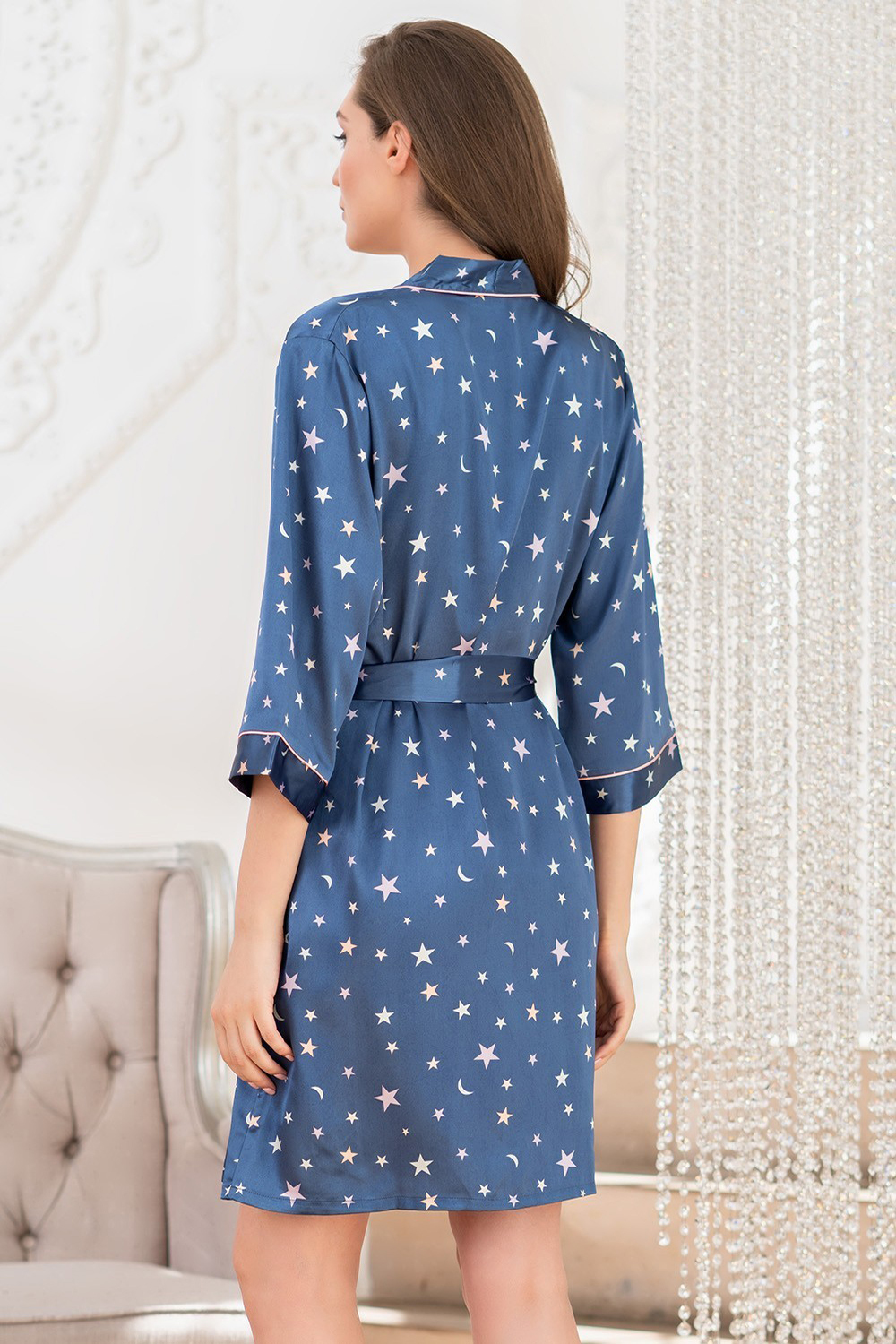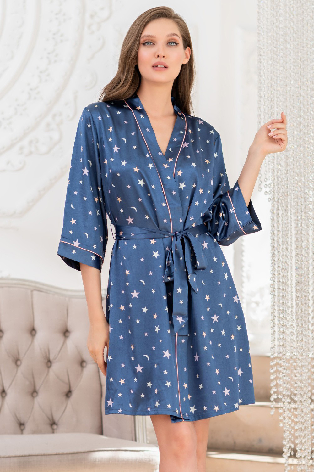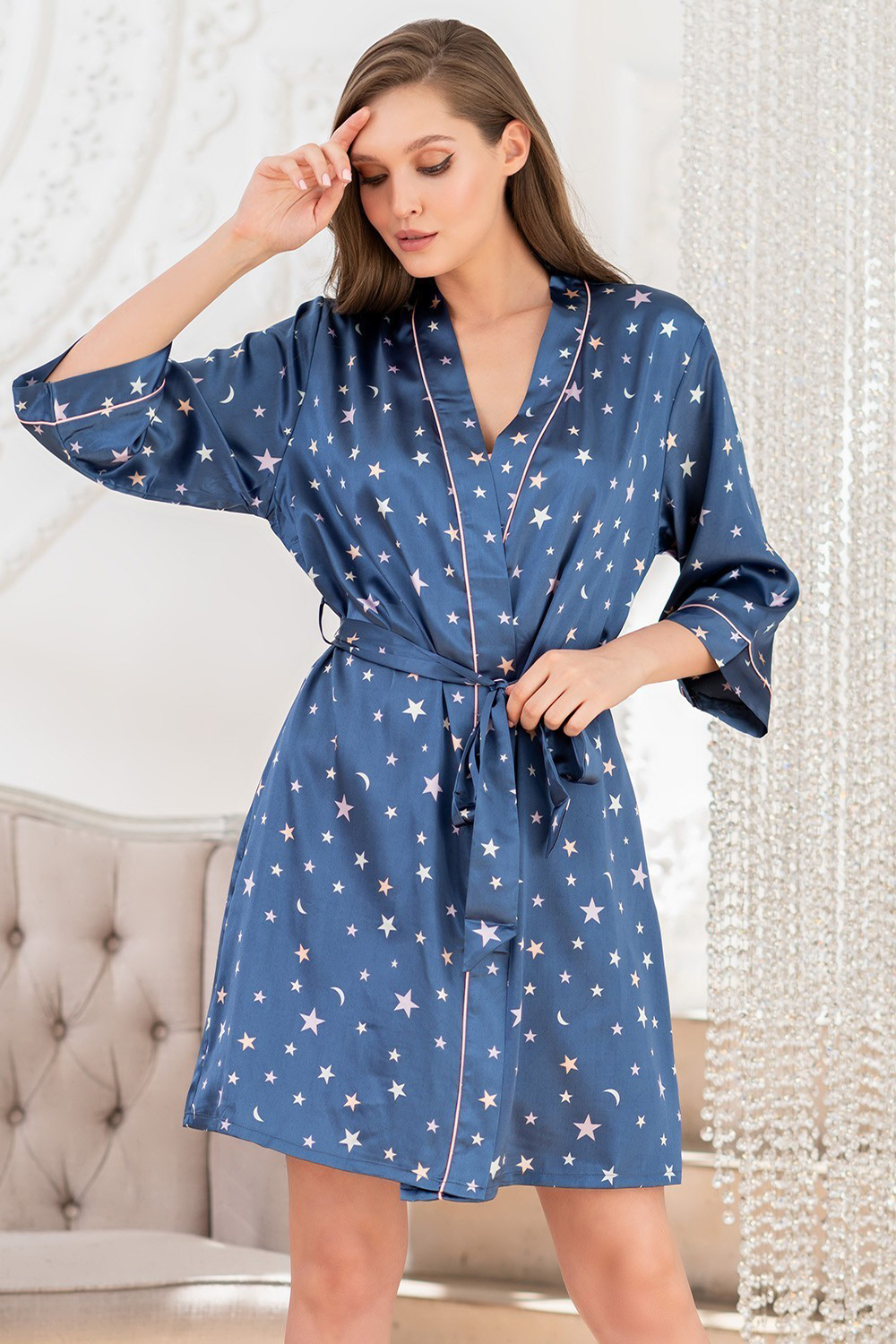 Короткий халат Mia-Mella с рукавами 3/4 выполнен из принтованного искусственного шелкового полотна с атласным блеском. Низ рукавов и борт халата декорированы контрастным кантом. Халат на запахе с поясом, в боковых швах есть карманы.