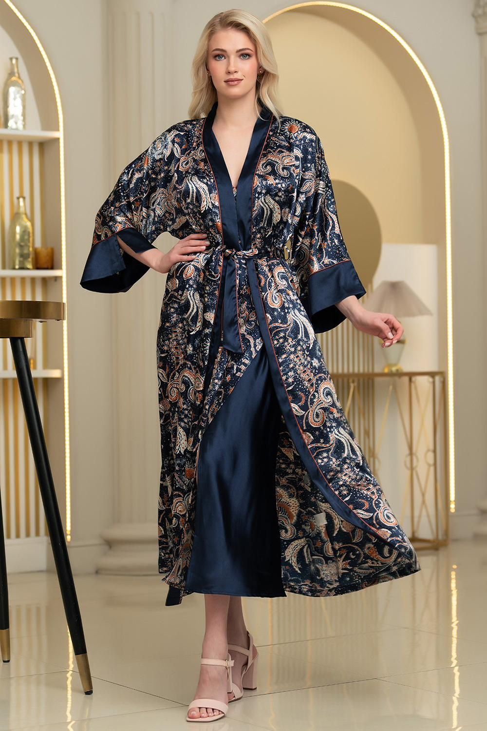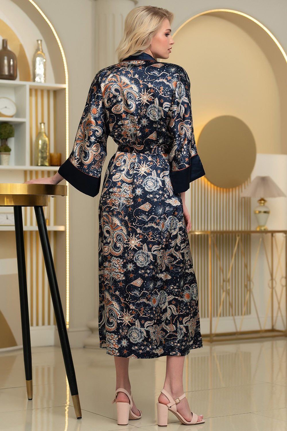 Длинный запашной халат-кимоно Mia-Amore с широкими длинными рукавами. Изделие выполнено из принтованного атласа с однотонной отделкой по бортам и низу рукавов, контрастный кант выступает границей между двух видов материалов. В боковых швах обработаны карманы. Изделие дополнено двухцветным поясом с кантом.