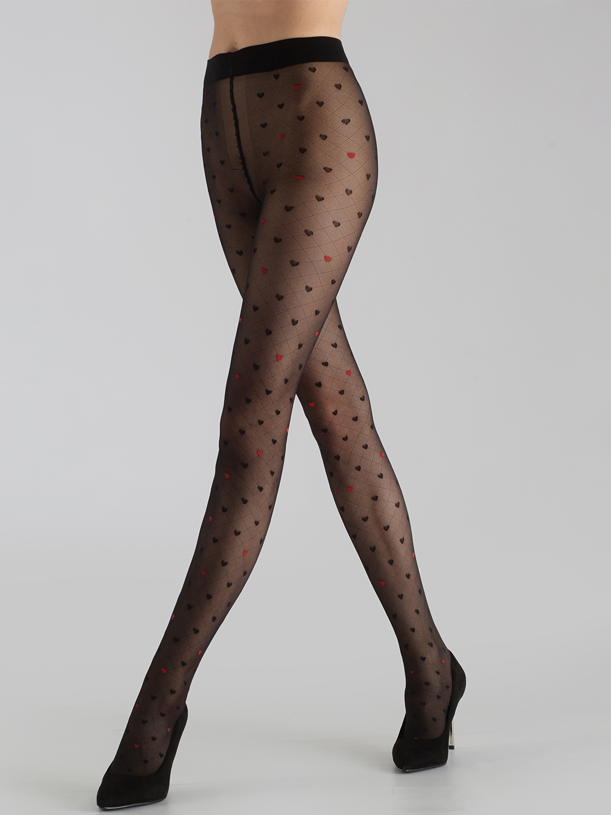 Прозрачные фантазийные колготки с оплетенным эластаном, плотностью 40 ден, c широким комфортным поясом, х/б ластовицей и усиленными плоскими швами. Вся нога модели украшена тканым узором "сетка с разноцветными сердечками". Эластан, обкрученный полиамидом, обеспечивает хорошую растяжимость модели и придает ей мягкость. Колготки связаны на новейшем оборудовании, что гарантирует их перманентно высокое качество.
