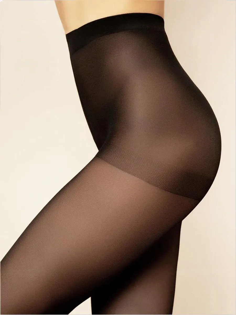 Матовые поддерживающие женские колготки средней плотности 40 ден с массажным эффектом и распределённым давлением по ноге. Полупрозрачная структура плетения с гладким шелковистым эффектом. Классическая средняя линия талии, короткие уплотнённые шортики повышенной плотности, круглые соединительные швы, удобный пояс резинка шириной 3 см, не формованная ножка с прозрачным укреплённым мыском.