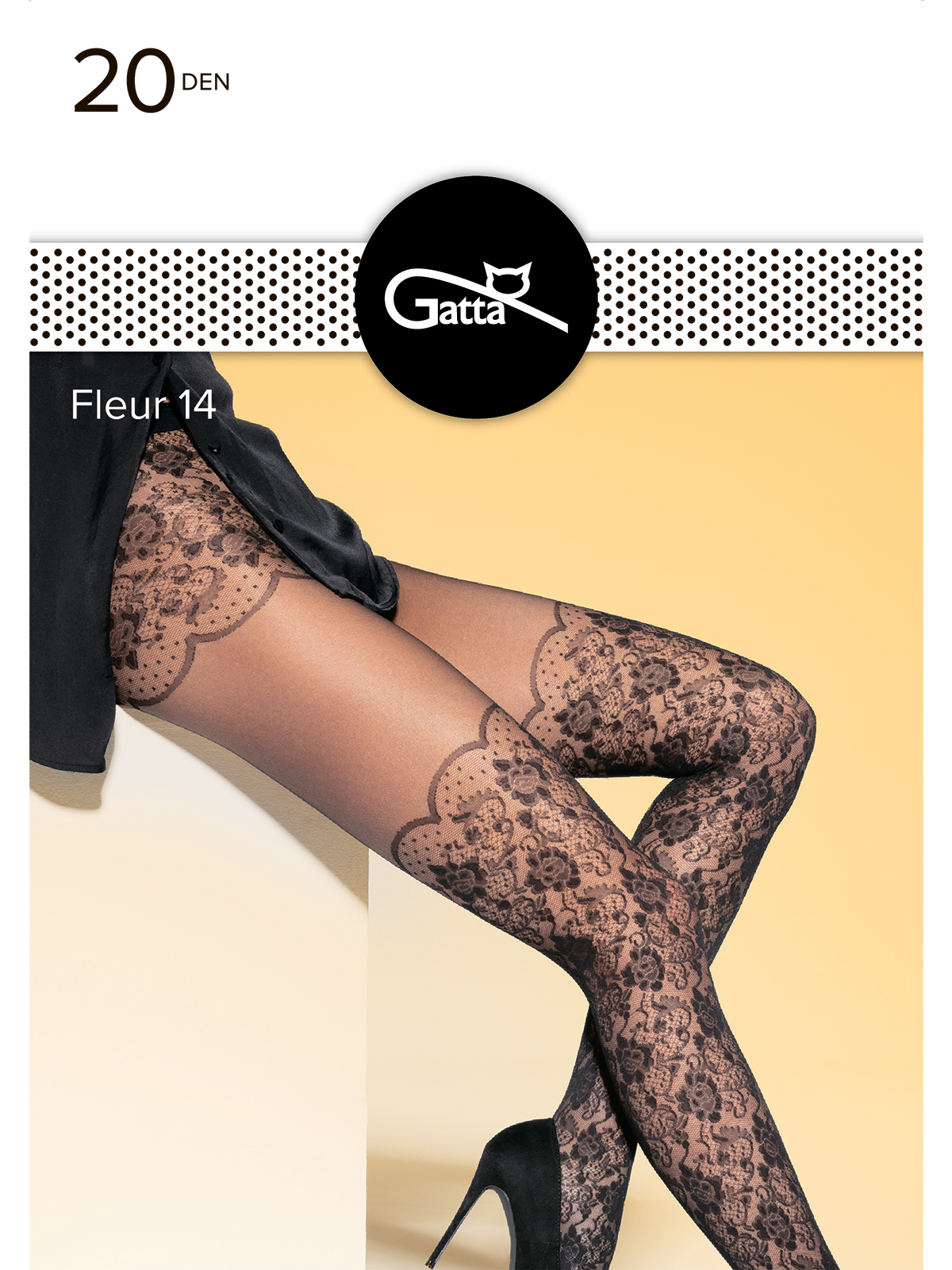 Тонкие фантазийные колготки с лайкрой, плотностью 20 ден, с широким комфортным поясом, гигиеничной ластовицей и усиленным плоским швом. На нижней части модели размещена имитация чулок с цветочным узором, вверху — имитация кружевных трусиков.