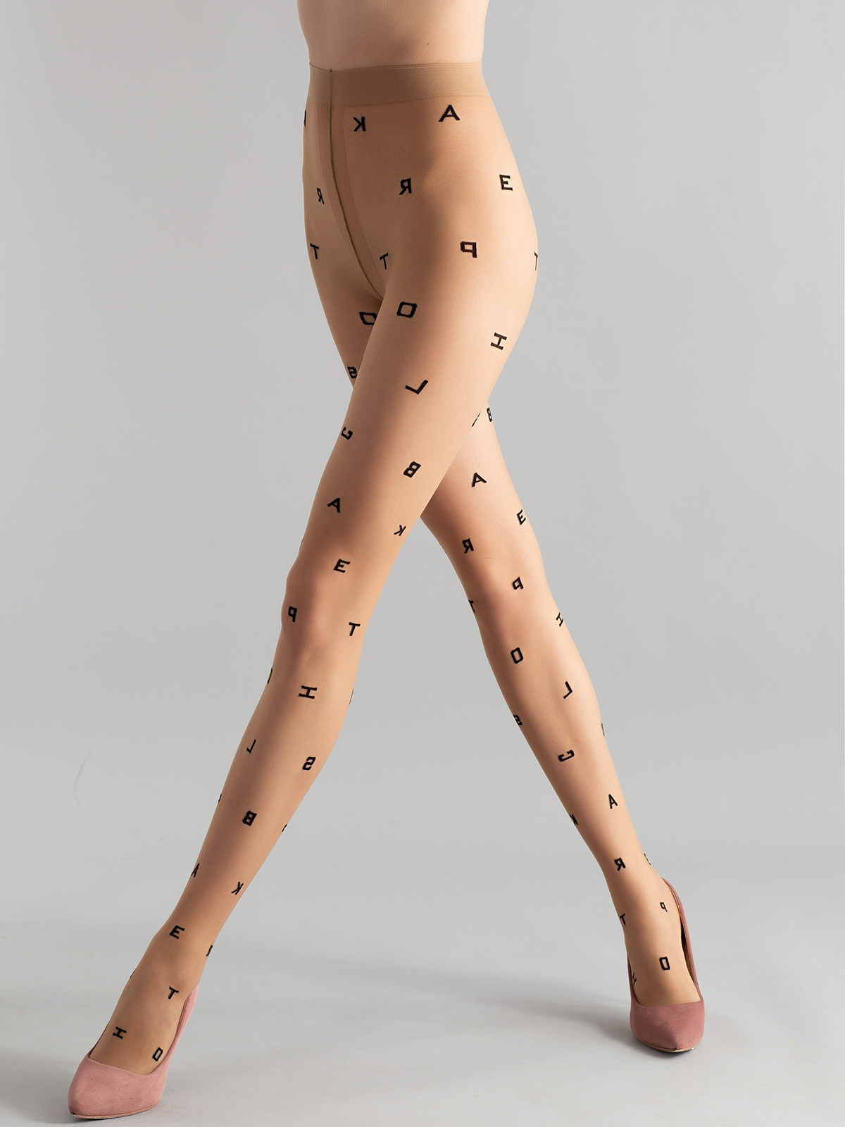 Тонкие фантазийные колготки с лайкрой, плотностью 20 ден, с широким комфортным поясом, гигиеничной ластовицей и усиленными плоскими швами. Вся нога модели украшена тканым узором "буковки".
