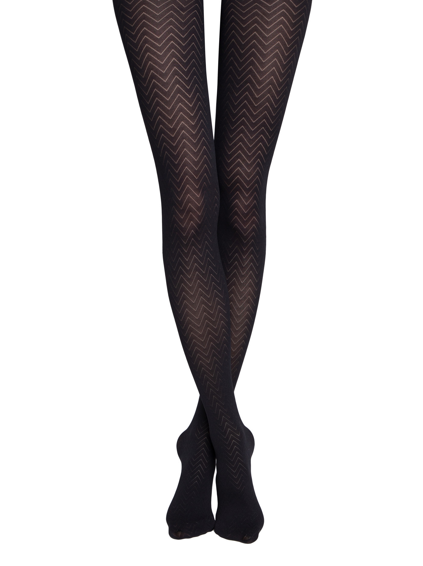 Полупрозрачные фантазийные женские колготки средней плотности 60 ден с трендовым зигзагообразным рисунком. Однородное без шортиков плетение по ножке, удобный пояс резинка шириной 3 см, комфортные плоские соединительные швы, хлопковая анатомическая ластовица.