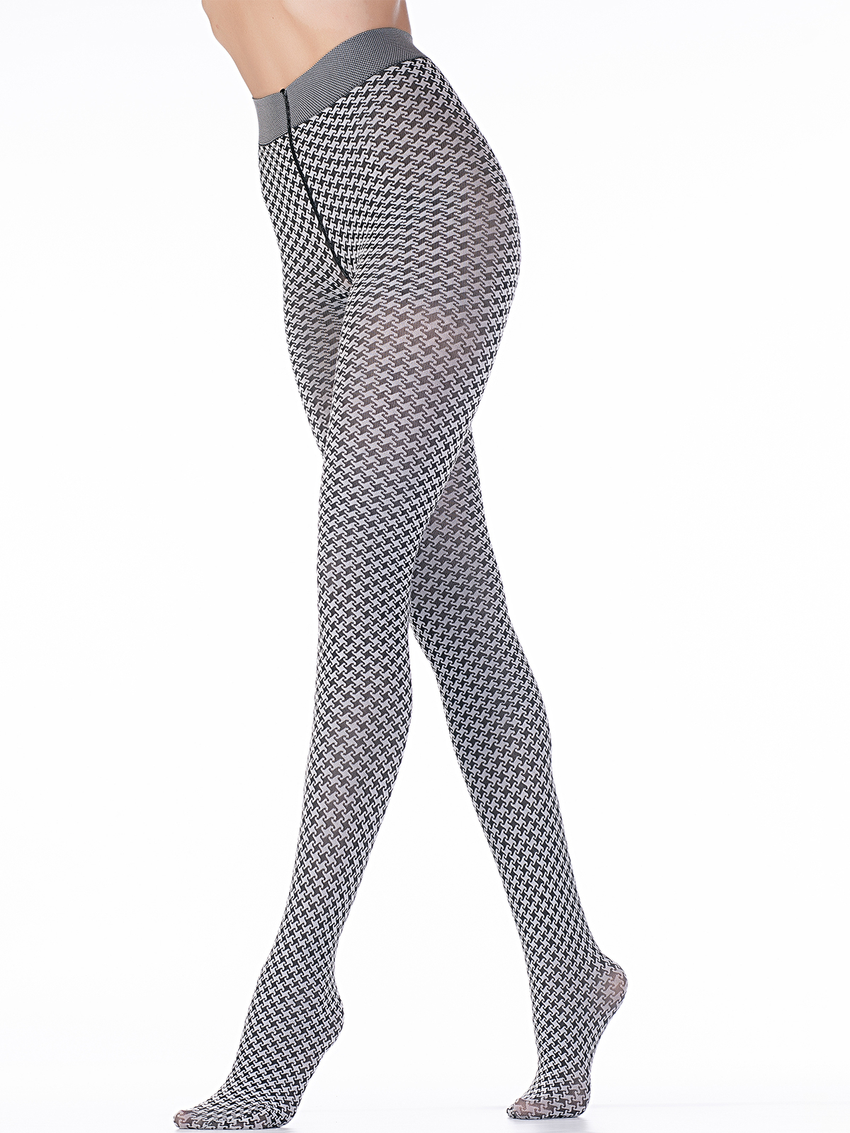 Непрозрачные фантазийные колготки из микрофибры c лайкрой 3D, плотностью 50 ден, с комфортным широким поясом, ластовицей и плоскими швами. Вся нога модели украшена ярким тканым узором "пепита".