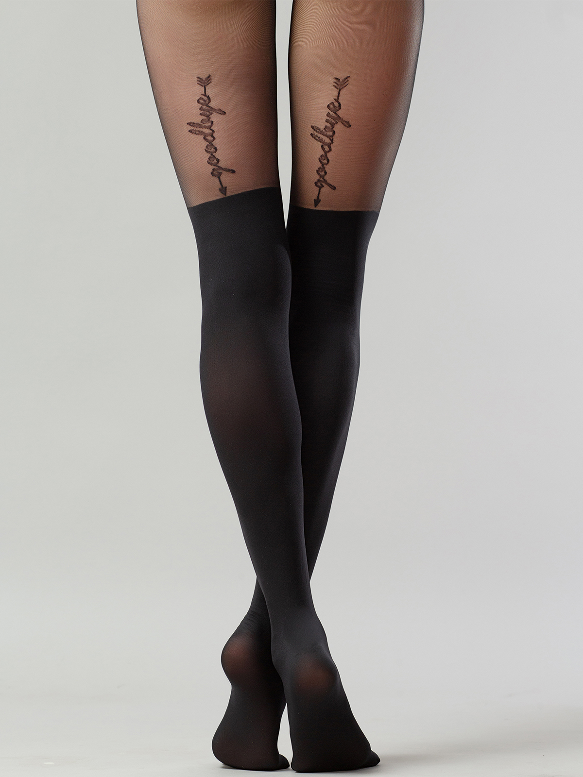 Матовые фантазийные плотные женские колготки плотностью 60 ден с имитацией непрозрачных гольфин из микрофибры и декорированной надписью в виде стрелки Goodbye на бёдрах. Анатомическая ластовица, широкий удобным пояс резинка, усиленные плоские соединительные швы.