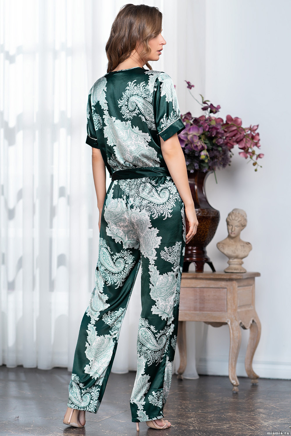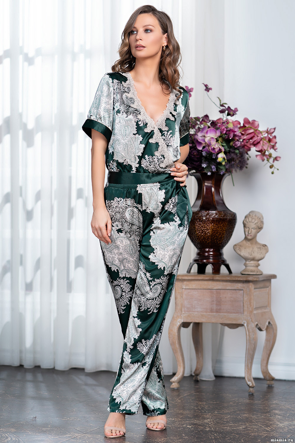 Комплект из блузы с брюками Mia-Amore выполнен из принтованного шелкового смесового полотна насыщенного изумрудного оттенка. Лиф блузы декорирован ажурным кружевом молочного цвета. Низ блузы, собран на пояс, который запахивает ее на красивый бант. У блузы короткий рукав со сборкой по окату оформлен по низу манжетой.