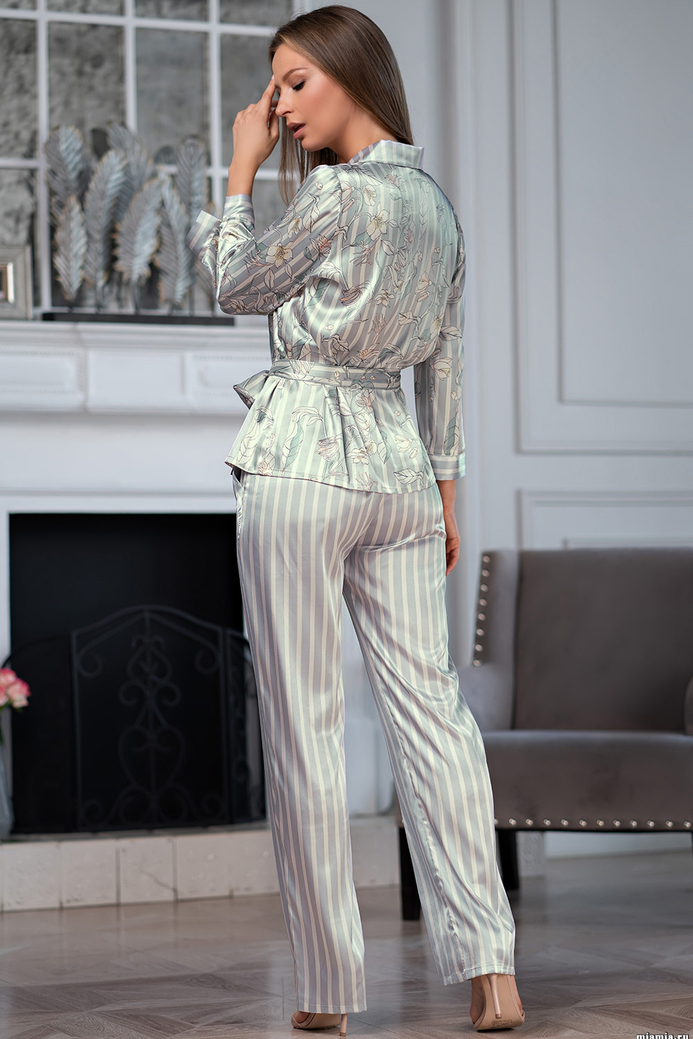 Комплект Mia-Amore состоит из жакета с рукавами 3/4 и брюк. Жакет выполнен из принтованного шелка с отделкой тканью компаньоном, а брюки полностью выполнены из ткани компаньона. По бокам брюк расположены карманы. Комплект дополнен поясом.