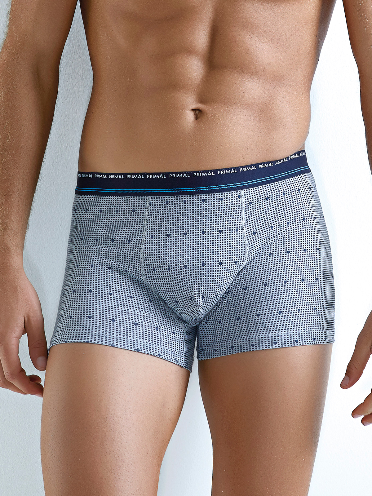 Мужские трусы-боксеры из хлопка с эластаном, на поясе широкая резинка с круговой надписью Primal. В упаковке 3 штуки: серые в клетку, синие с рисунком полоски и черные однотонные.