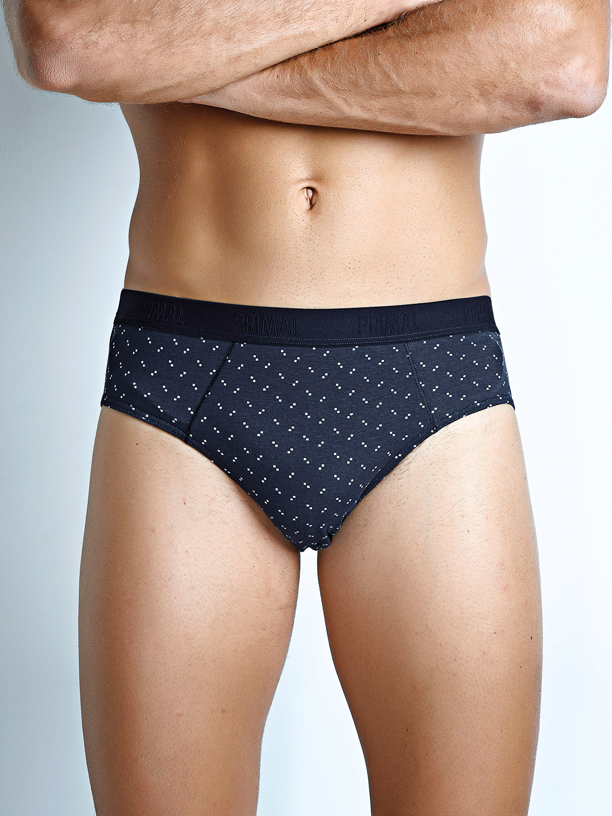 Мужские трусы-слипы из хлопка с эластаном, на поясе широкая резинка с круговой надписью Primal. В упаковке 3 штуки разного цвета с рисунком мелкие квадраты.