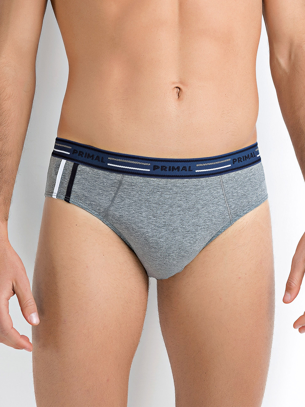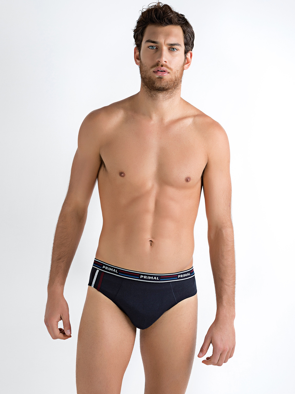 Мужские трусы-слипы из хлопка с эластаном, на поясе широкая резинка с прерывистыми линиями и круговой надписью Primal. Боковая часть модели декорирована асимметричными яркими тесемками.