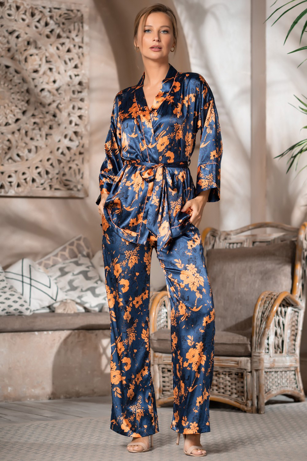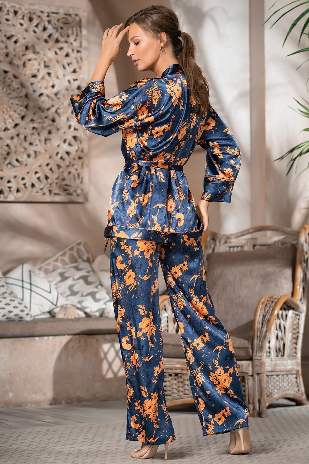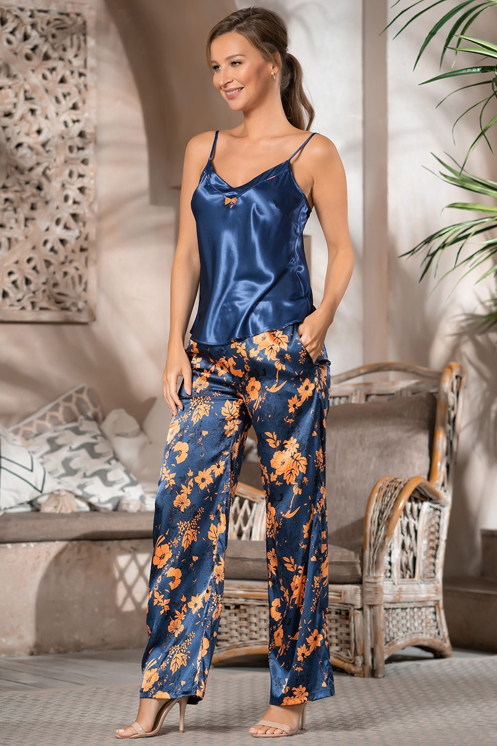 Комплект-тройка Mia-Amore состоит из топа на тонких бретелях, брюк-паллацо и запашного жакета, выполнен из принтованного смесового шёлка. Воротник, низ жакета и манжеты жакета декорированы контрастным кантом. Топ выполнен из синего атласа.
