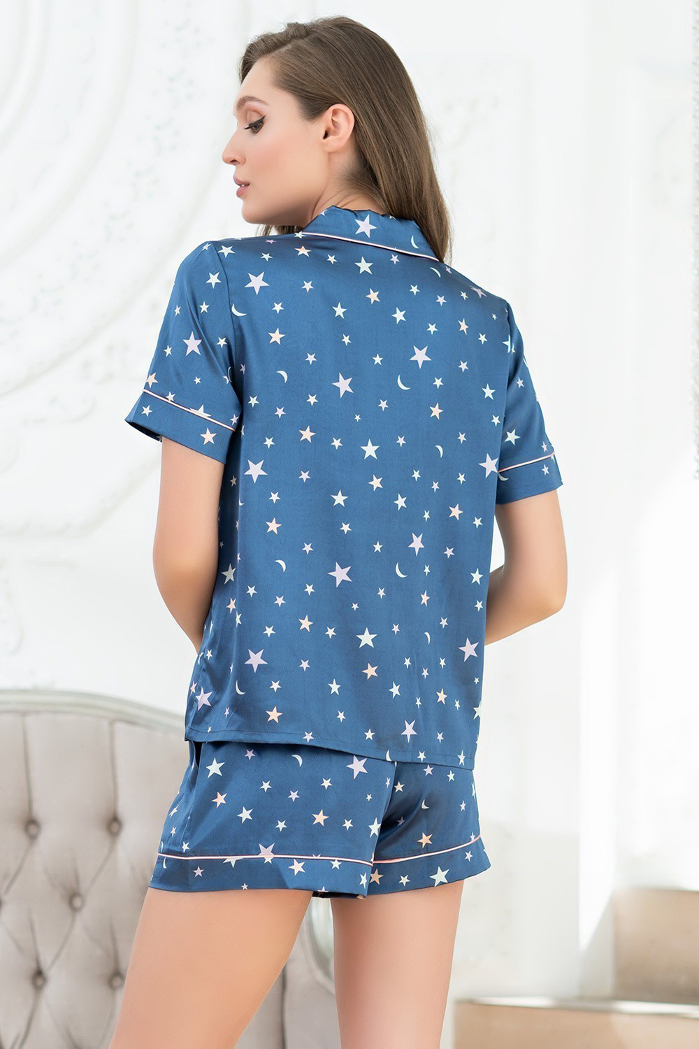 Комплект Mia-Mella состоит из рубашки с короткими рукавами, центральной застежкой на пуговицы и шорт. Комплект выполнен из искусственного принтованного шелка. Жакет и шорты оформлены кантом.