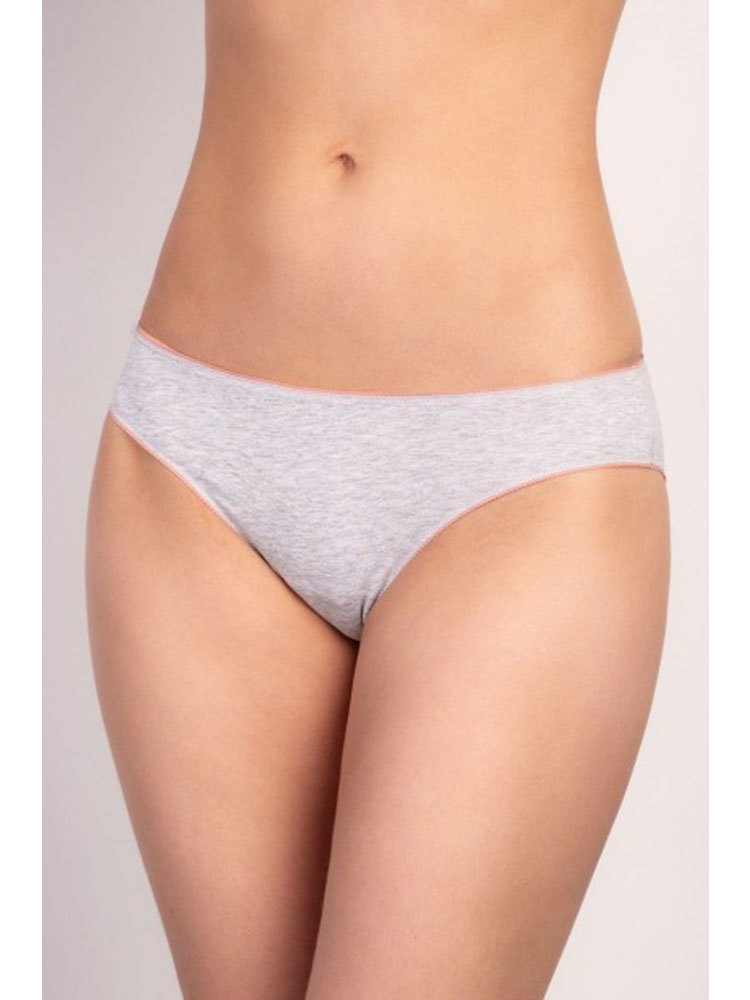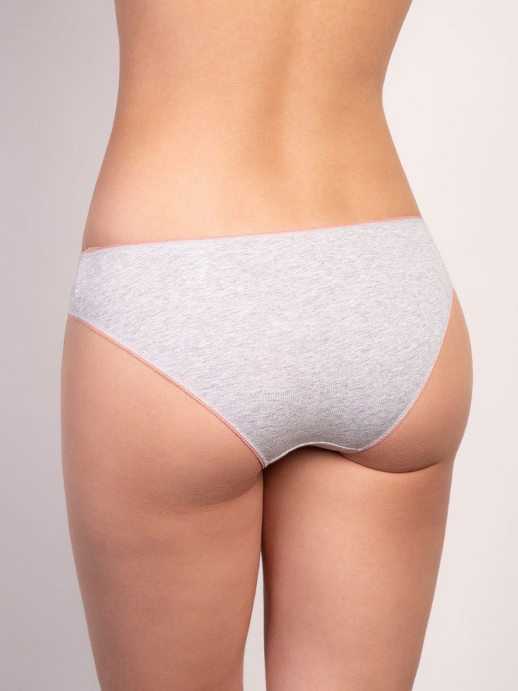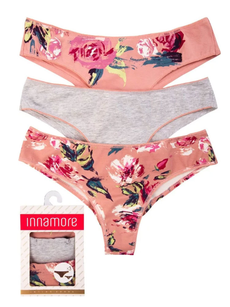 В наборе двое трусов в темно-розовой гамме с рисунком в виде ярких цветов роз и одни трусы в цвете серый меланж с контрастной розовой отделкой по краям.