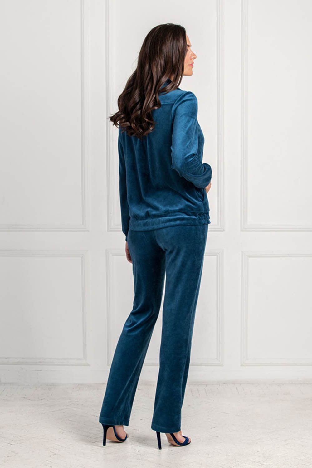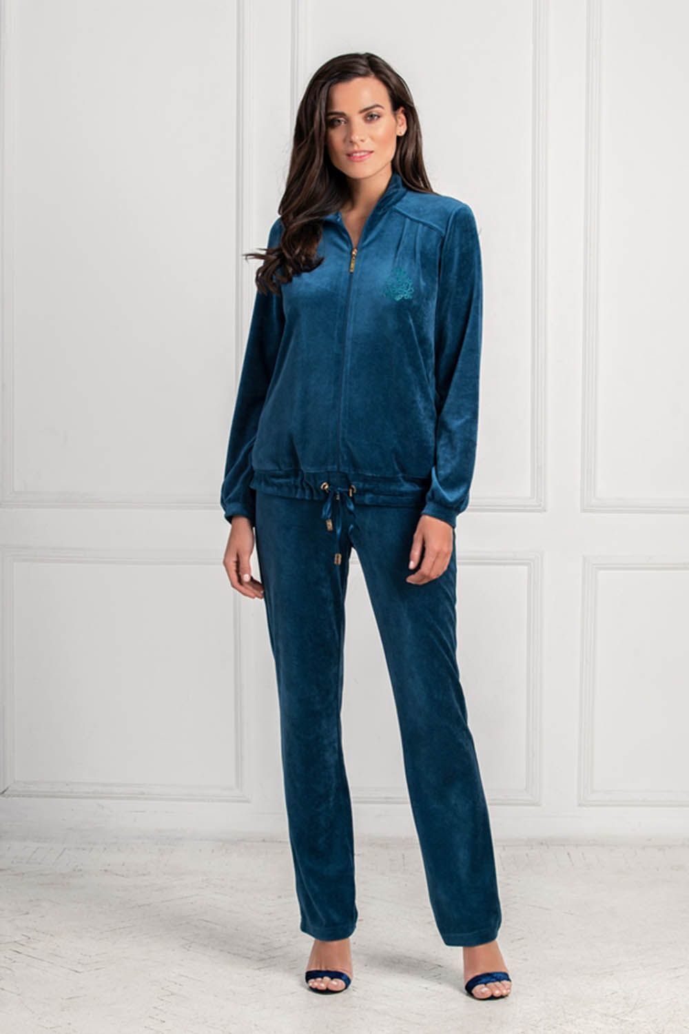 Отличный домашний костюм из мягкой велюровой ткани насыщенного изумрудного цвета, состоящий из двух предметов. Курточка свободного силуэта с застёжкой на молнию и широким воротником-стоечкой. По низу проходит кулиска с завязками, позволяющими регулировать объем курточки. На левой груди красивый рисунок из мелких золотистых страз. Глубокие боковые карманы добавляют модели функциональности. Свободные брюки прямого покроя с резинкой по талии очень комфортные и подойдут на любую фигуру. Удобство и красота Вам гарантированы.