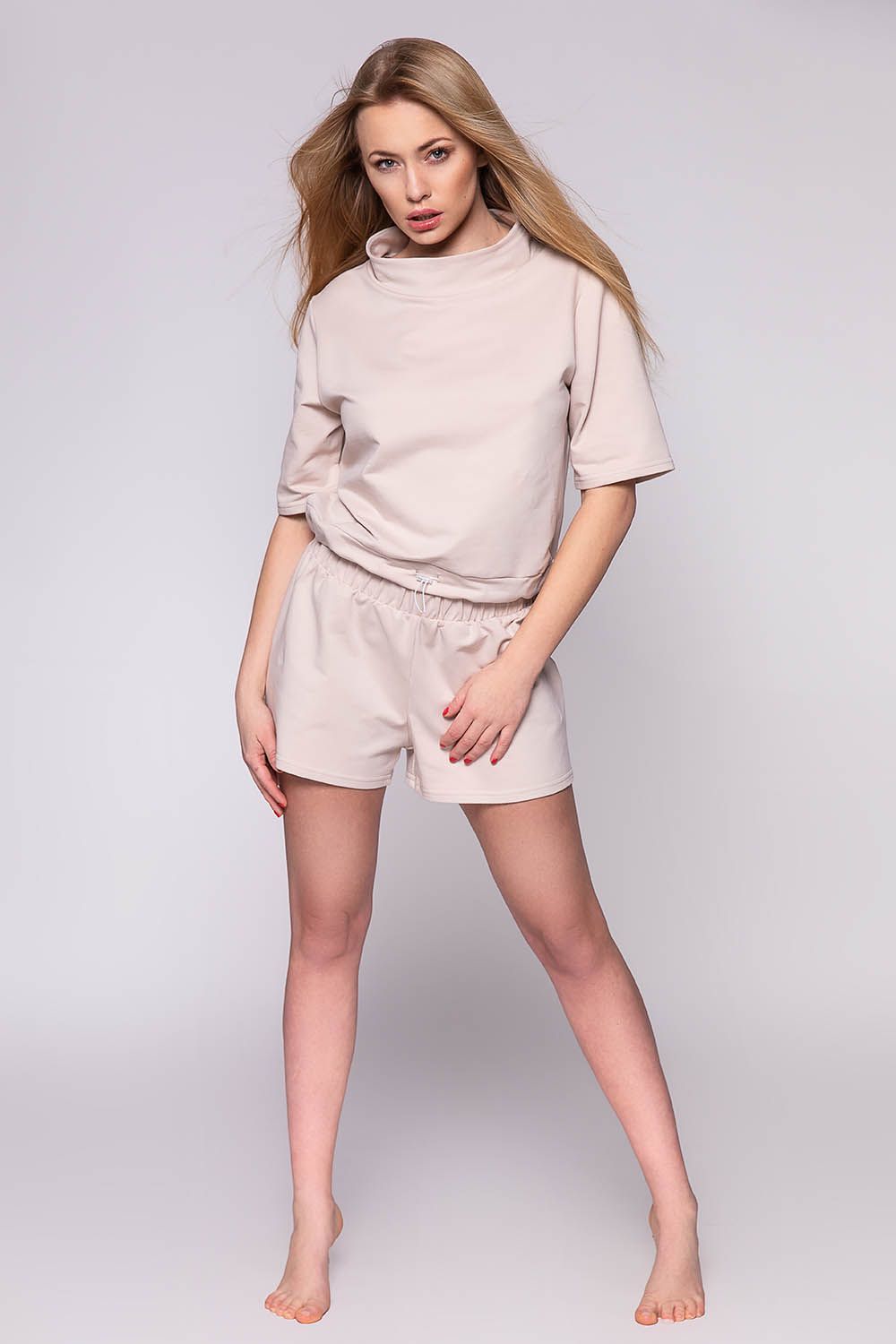 Стильный костюм Gillian состоит из кофты с воротником стойка и шортиков на широкой мягкой резинке. Кофта свободного кроя с короткими рукавами, низ на кулисе.