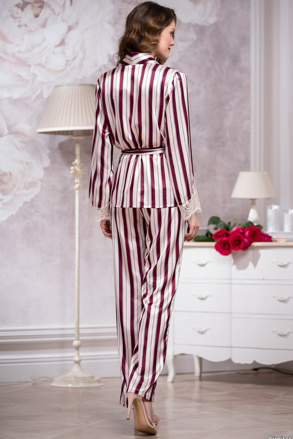 Элегантный костюм-тройка Mia-Amore из искусственного принтованного шелка в полоску, состоит из жакета, топа и брюк. Жакет свободного силуэта с длинными рукавами, с отложным воротником с фиксацией на пуговицу и поясом. Низ рукавов декорирован кружевом. Топ на тонких бретелях, лиф украшен кружевом. Брюки классические, на завязках, с карманами в боковых швах.