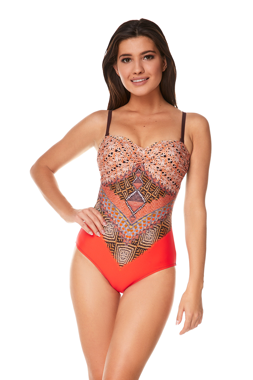 Слитный купальник K.8228_857 с формованными чашками с push-up вкладышами. Бретели регулируются по длине и отстегиваются, на спинке нерегулируемая застежка. Изделие декорировано эффектным принтом.