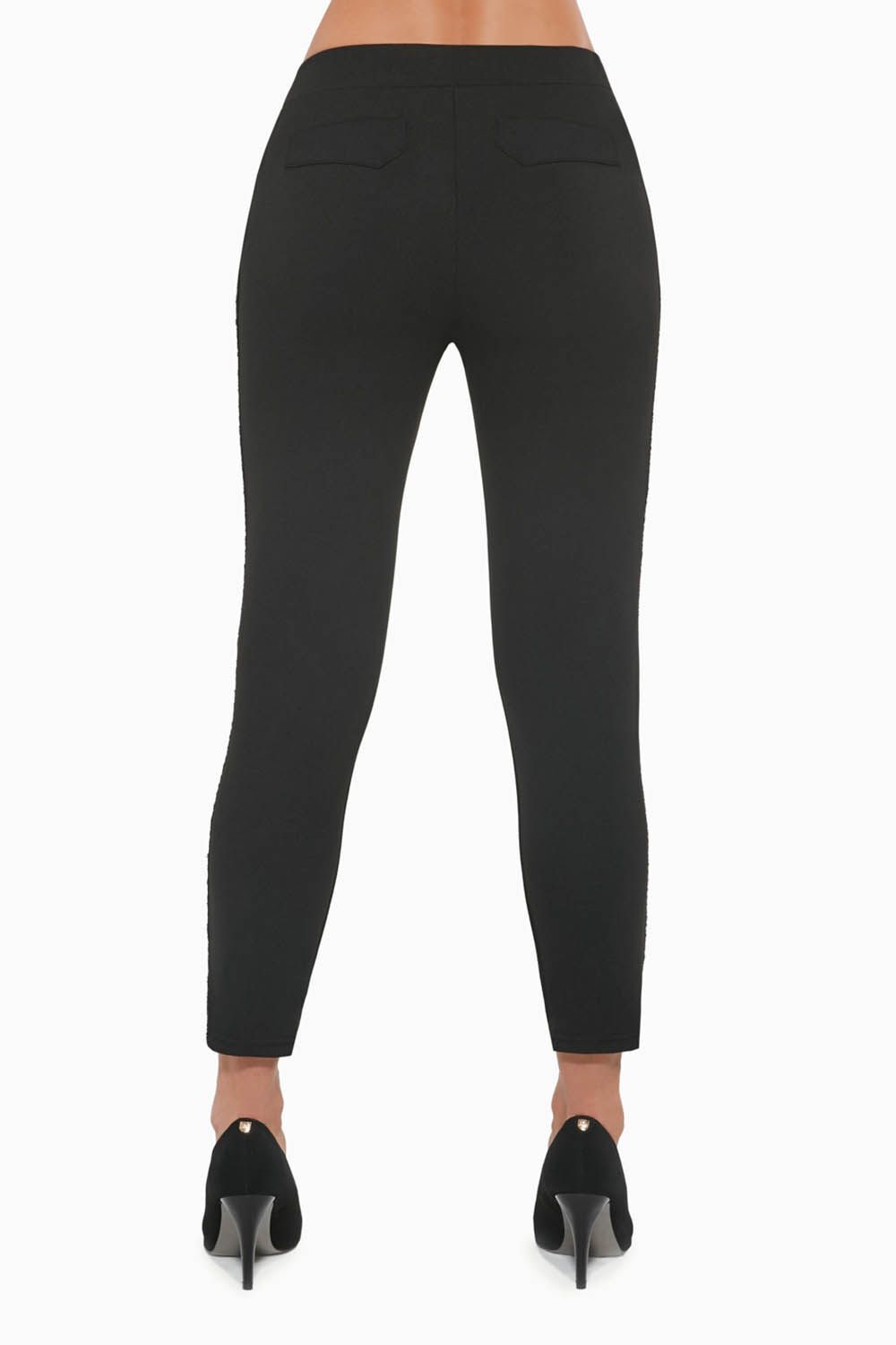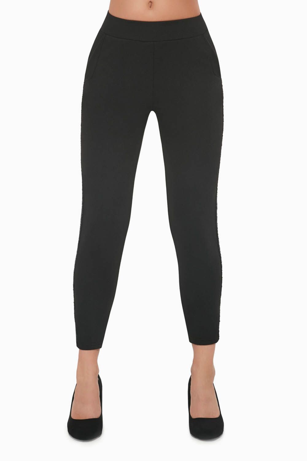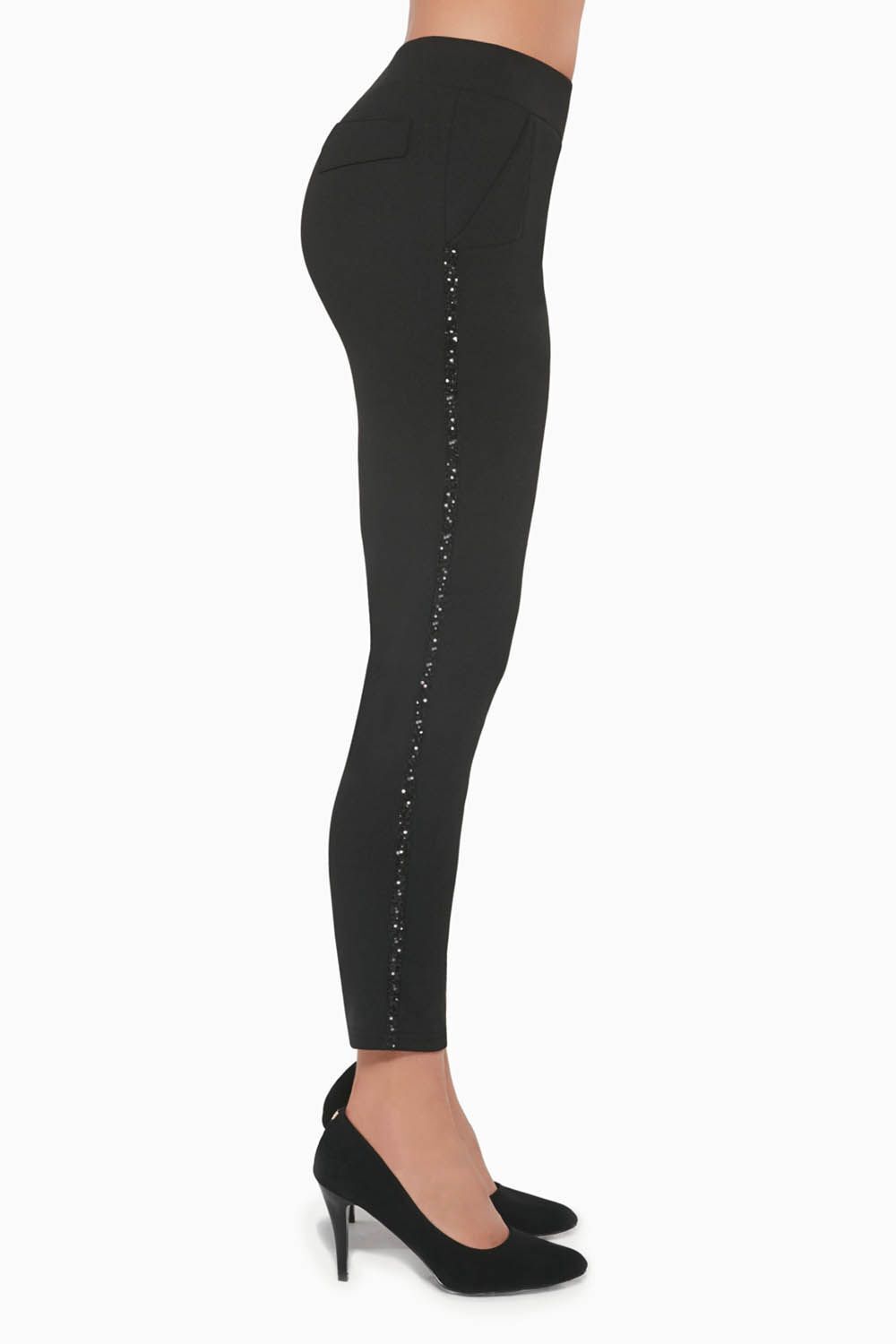 Черные леггинсы Oriana с карманами, выполнены из эластичного крепа, по бокам лампасы. Леггинсы упакованы в красивую плотную коробку.