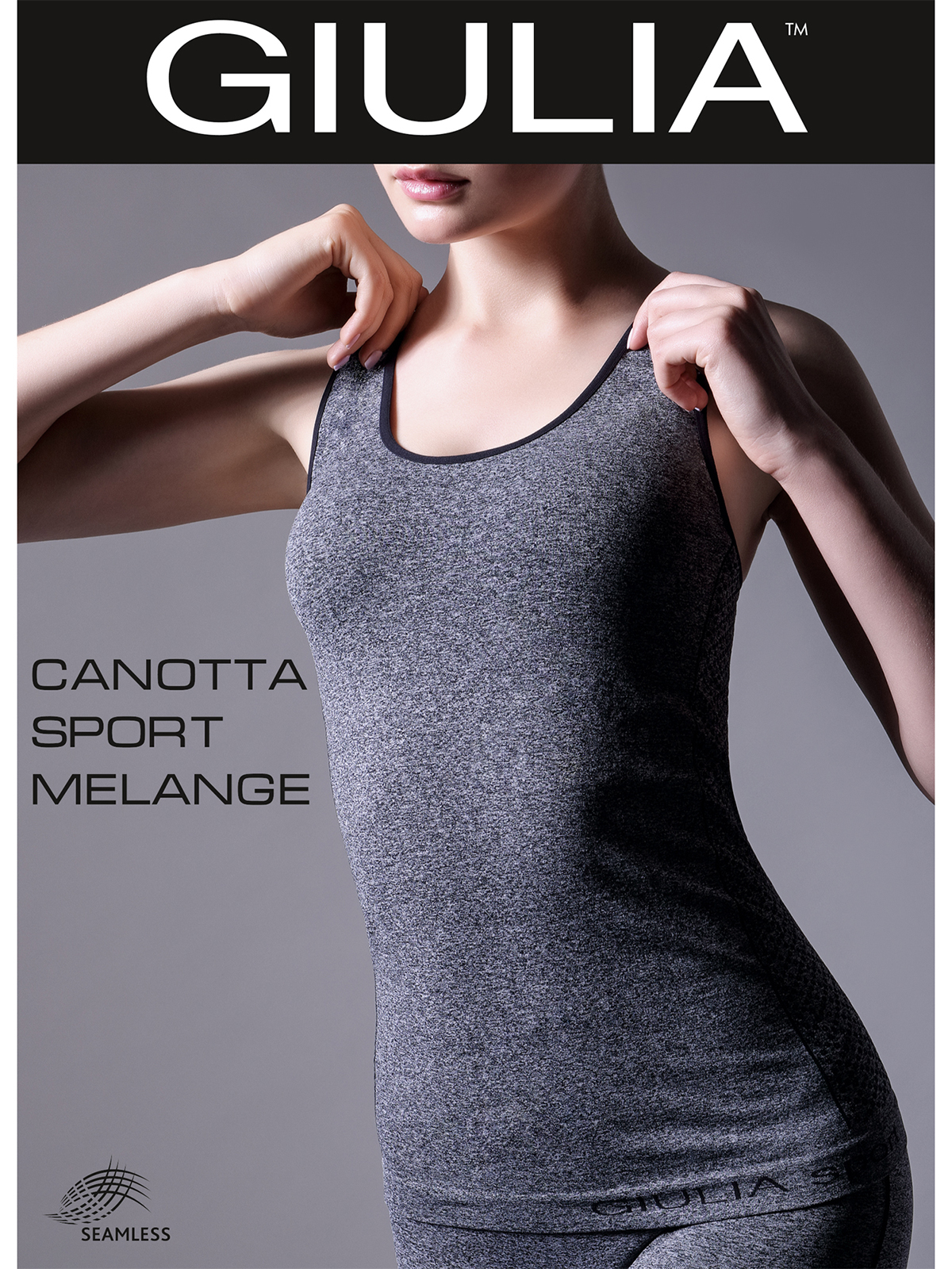 Спортивная майка-борцовка из мягкой дышащей микрофибры с эффектом меланж, облегающая, с широкими бретелями и глубоким овальным вырезом.