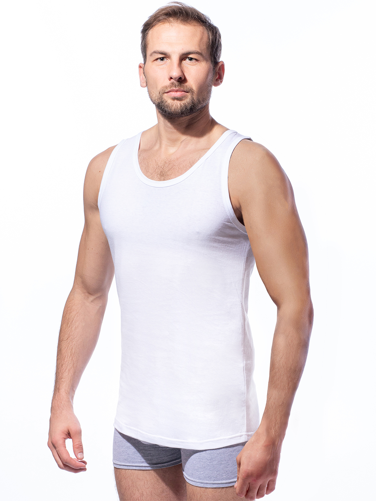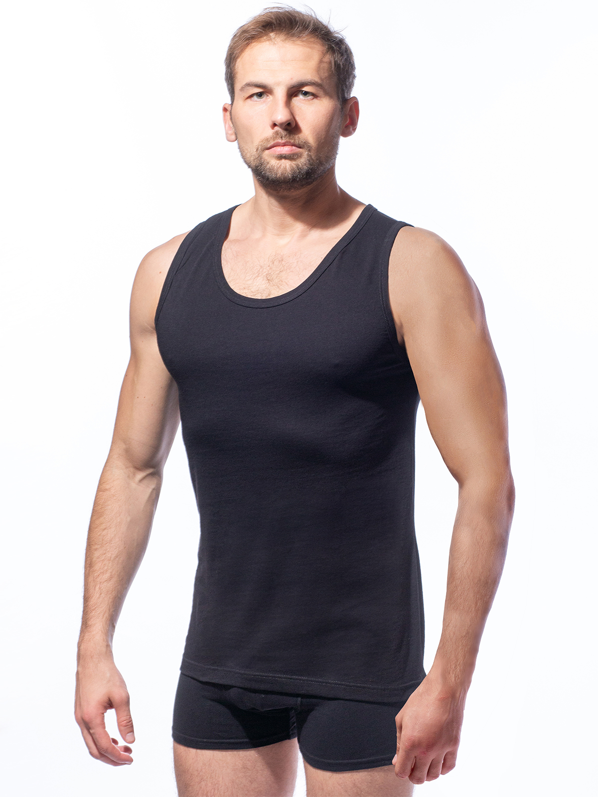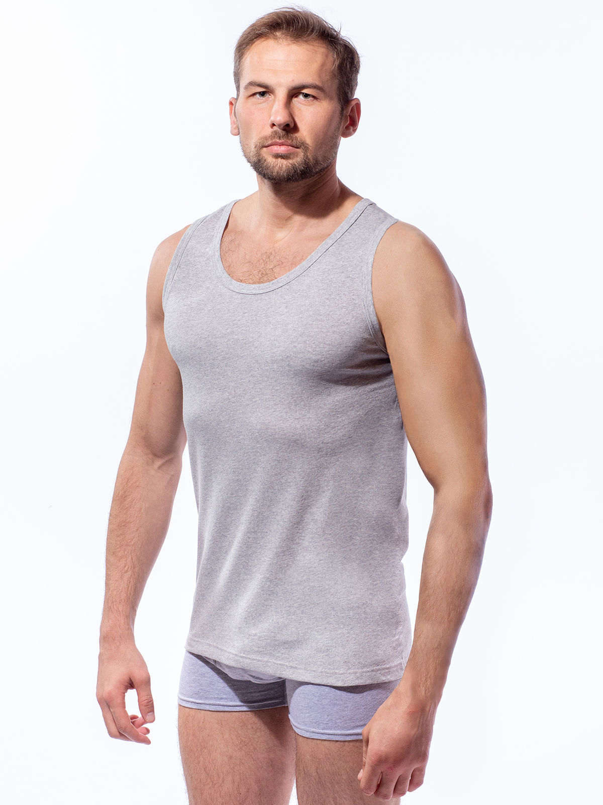 Хлопковая мужская майка с овальным вырезом и широкими бретелями, однотонная.