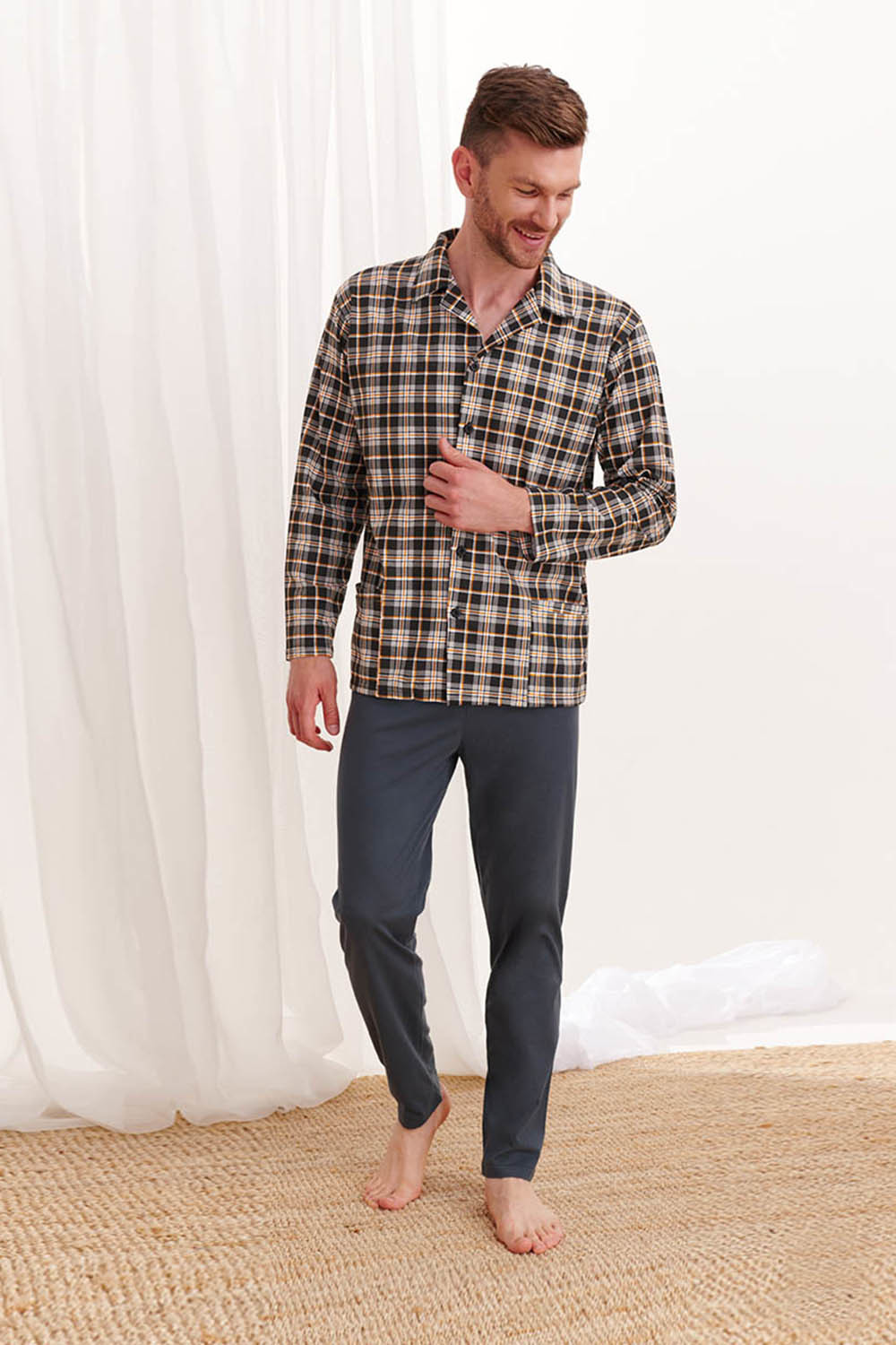Мужская хлопковая пижама Gracjan состоит из клетчатой рубашки и однотонных прямых брюк. Рубашка свободного кроя, с длинными рукавами и накладными карманами. Брюки на мягкой широкой резинке. Пижама идеально подходит для сна и в качестве домашнего костюма.
