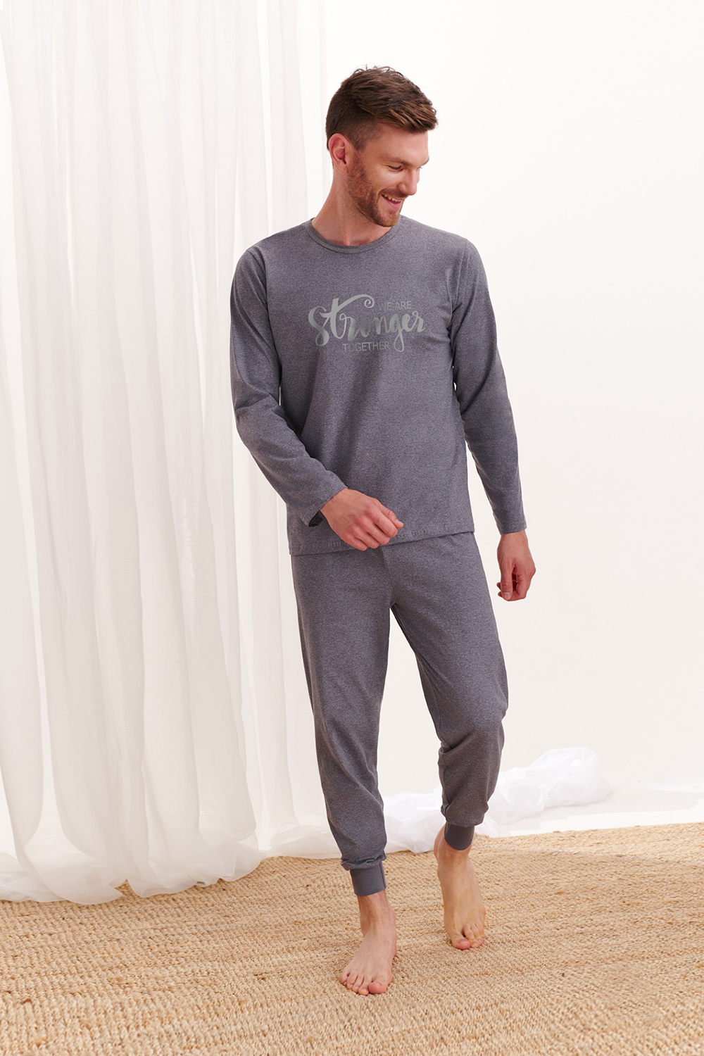 Мужская хлопковая пижама Michal состоит из лонгслива и брюк. Лонгслив свободного кроя, с длинными рукавами и круглым вырезом горловины, на груди принт в виде надписи. Брюки с манжетой-резинкой по низу. Пижама идеально подходит для сна и в качестве домашнего костюма.
