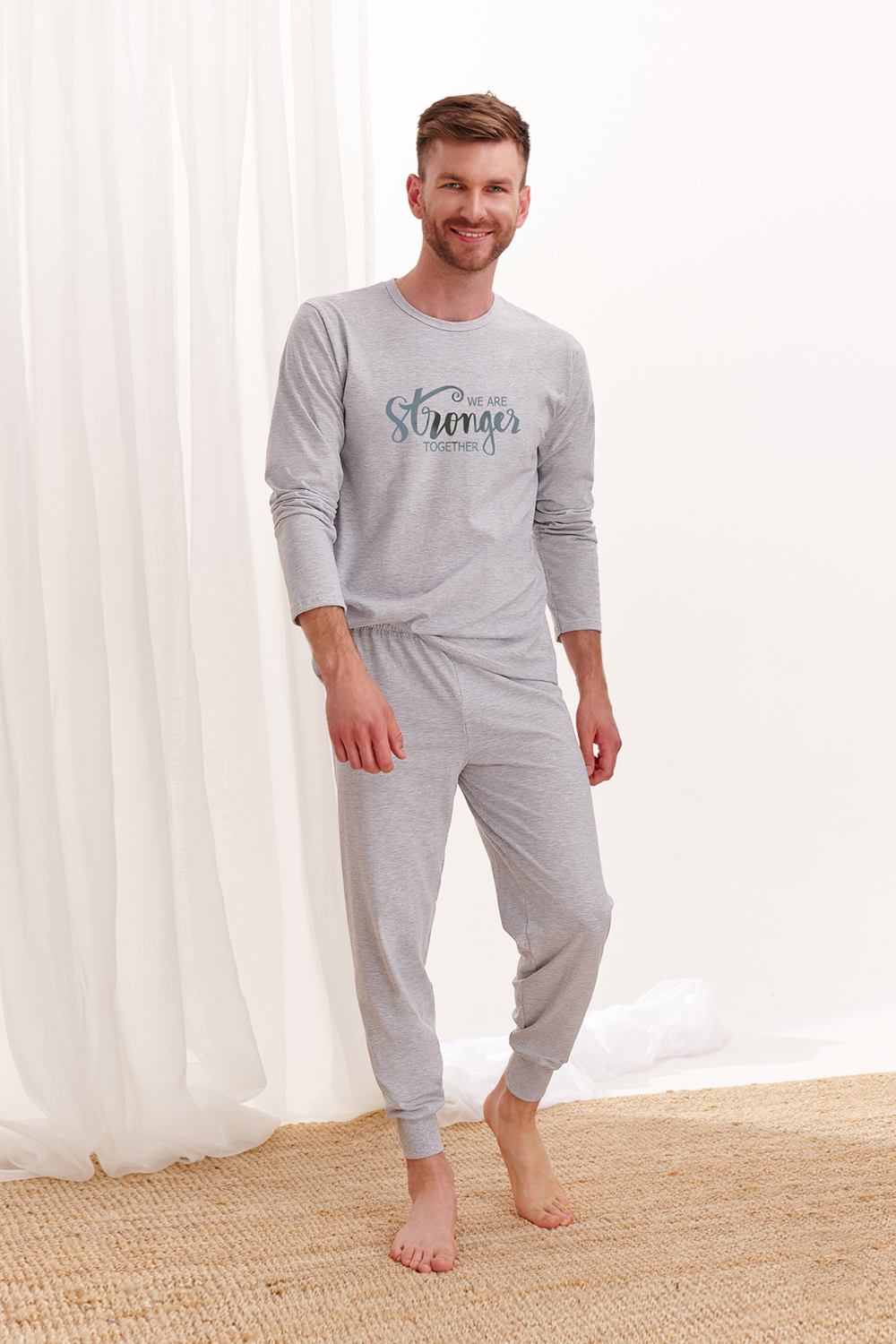 Мужская хлопковая пижама Michal состоит из лонгслива и брюк. Лонгслив свободного кроя, с длинными рукавами и круглым вырезом горловины, на груди принт в виде надписи. Брюки с манжетой-резинкой по низу. Пижама идеально подходит для сна и в качестве домашнего костюма.