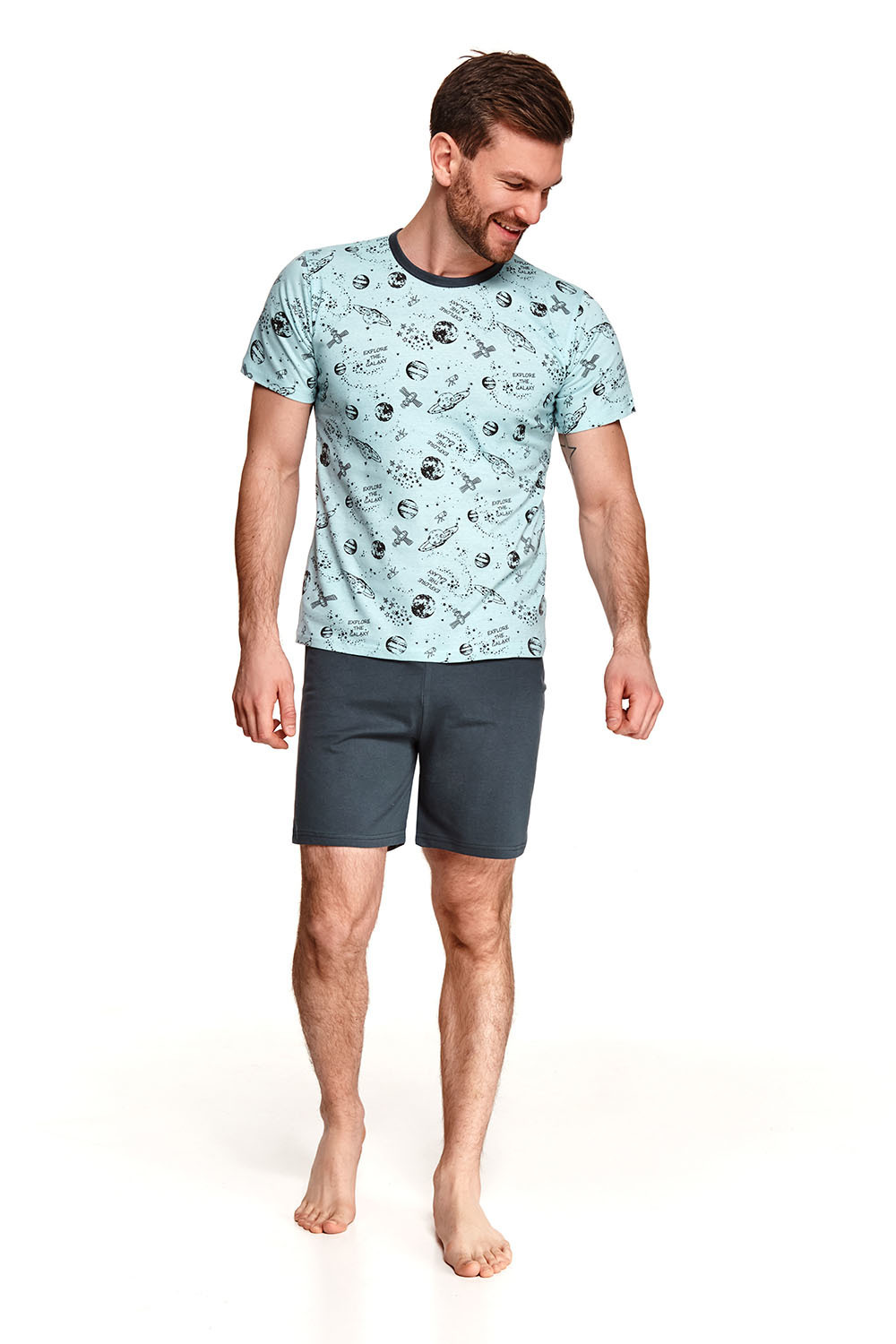 Мужская хлопковая пижама Max состоит из принтованной футболки и однотонных шорт. Футболка свободного кроя, с круглым вырезом горловины. Шорты на мягкой широкой резинке. Пижама идеально подходит для сна и в качестве домашнего костюма.