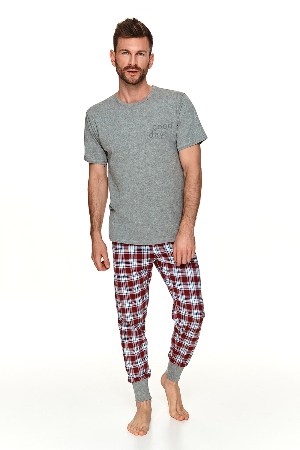Серая мужская хлопковая пижама Fedor состоит из футболки и клетчатых брюк. Футболка свободного кроя, с круглым вырезом горловины. Брюки на мягкой широкой резинке. Пижама идеально подходит для сна и в качестве домашнего костюма.
